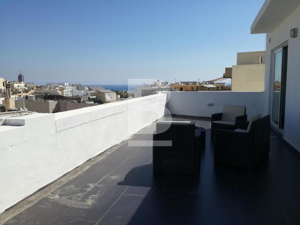 A spacious penthouse forming part of a smart block. Property was recently finished and measures approximately 130m2 internally and 80m2 externally. Attractive layout consists of an entrance hall, fitted kitchen, spacious lounge/dining room leading to an extensive terrace enjoying lovely open/sea views,2 bedrooms, bathrooms, 1 en suite, rear balcony and car space. A lovely home. Viewing is a must.