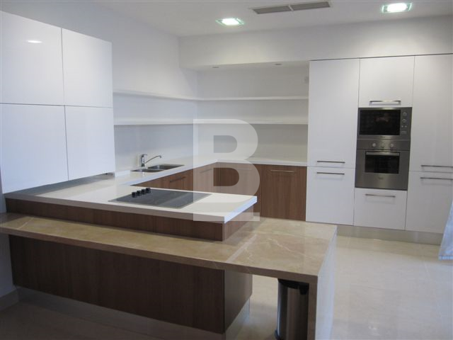 A brand new fourth floor APARTMENT situated in this lovely luxurious development which includes communal pool area, gardens, shopping arcade and various restaurants and cafeterias. Property consists of a study room, sitting/dining/living/kitchen leading onto a spacious terrace enjoying distant views, 3 bedrooms(main with bathroom ensuite and terrace), side balconies, bathroom, washroom with a balcony to dry clothes and a 1 car lock up garage. This apartment is fully air-conditioned and includes parquet flooring in all the bedrooms.