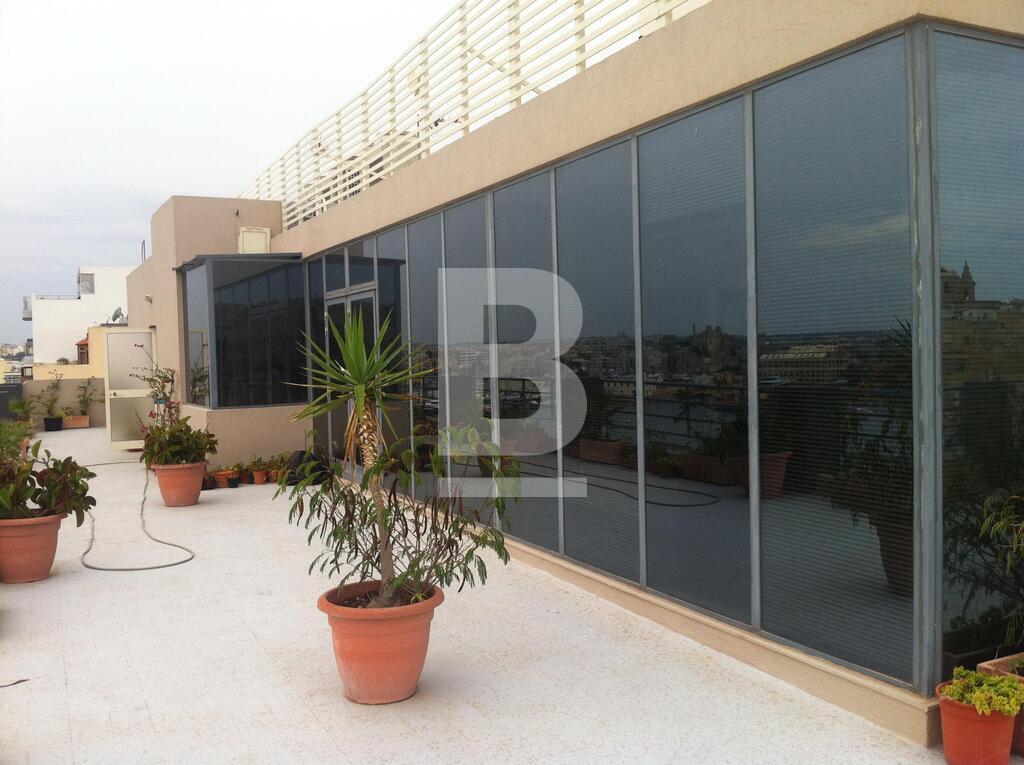 A centrally located corner seafront penthouse office space situated in this very well maintained and prestigious office block which offers excellent views of Sliema Creek, Manoel Island and Valletta Bastions. This premises consists of a total office area of approximately 150sqm leading onto a large L-shaped terrace measuring approx 90sqm and enjoying stunning views all around. The layout is versatile, offering the option between an open plan office space with bathroom & kitchenette facilities or a reception area with various partitioned office spaces. Included is Air Conditioning throughout and all network and electrical cabling systems. Well worth a consideration!