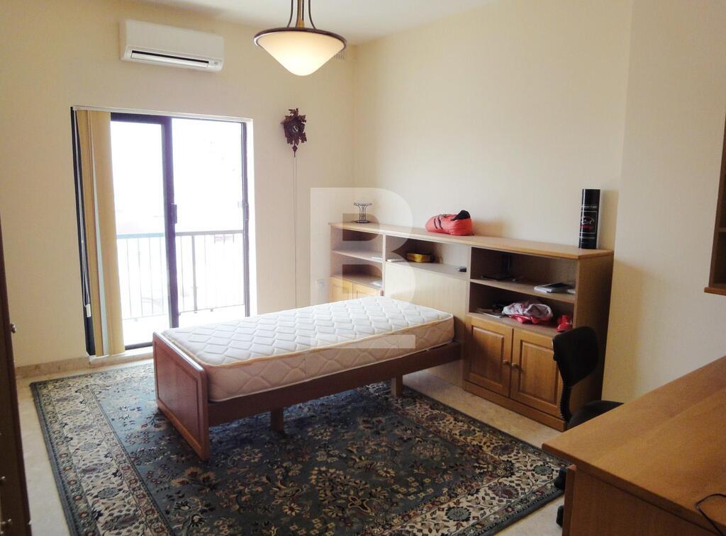 Larger than usual, fully furnished sixth floor apartment served with lift, overlooking the sea with panoramic views of Valletta. Property is centrally located, close to all amenities and consists of a combined kitchen / dining room, large living area leading to balcony with views, two bathrooms (main with en-suite facilities), guest toilet, three large bedrooms, separate washroom and gym. Fully equipped with air-conditioning units, flat screen TV, washing machine, tumble dryer and dishwasher. TVs also in the 3 bedrooms and satellite dish with 3 receivers. Optional garage also available at EUR100 monthly.