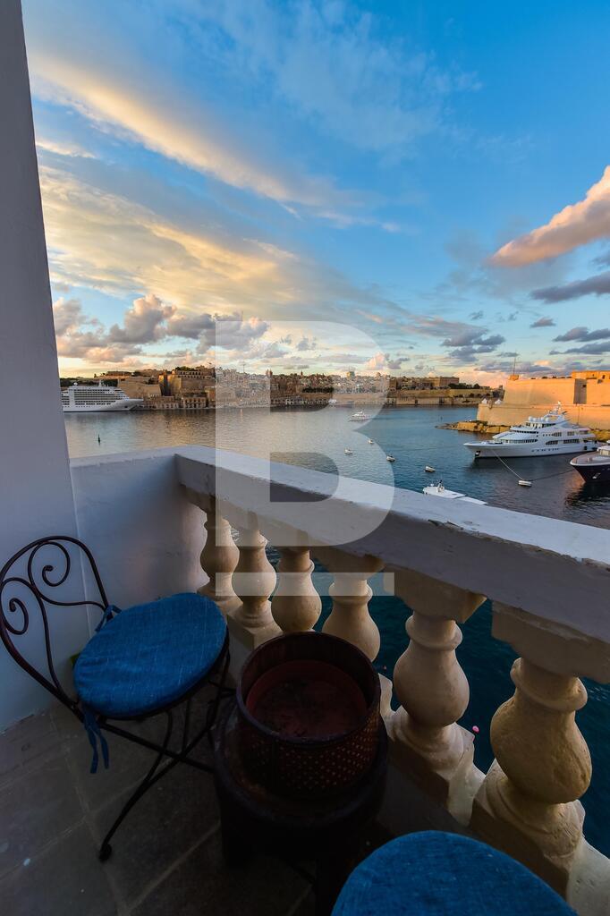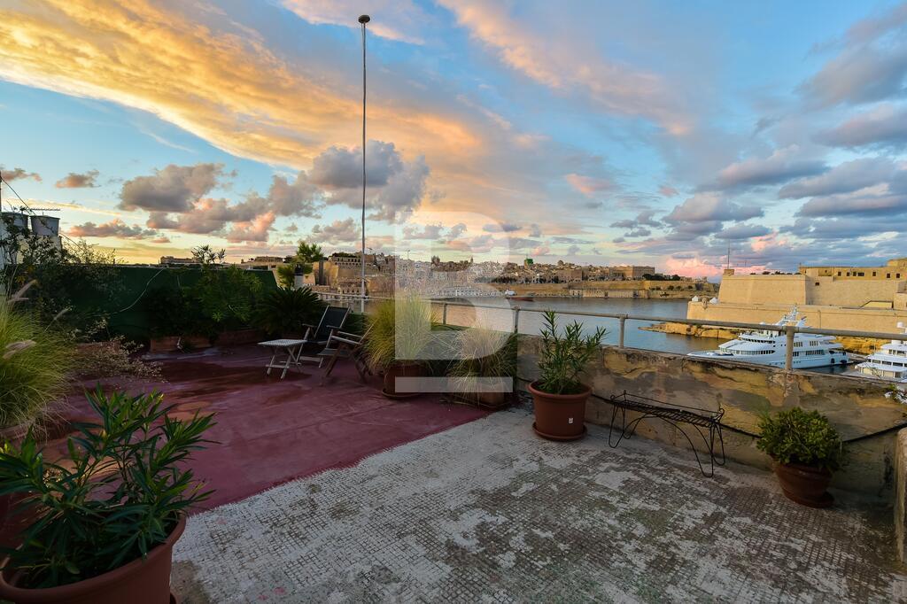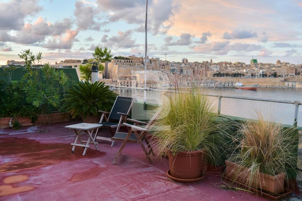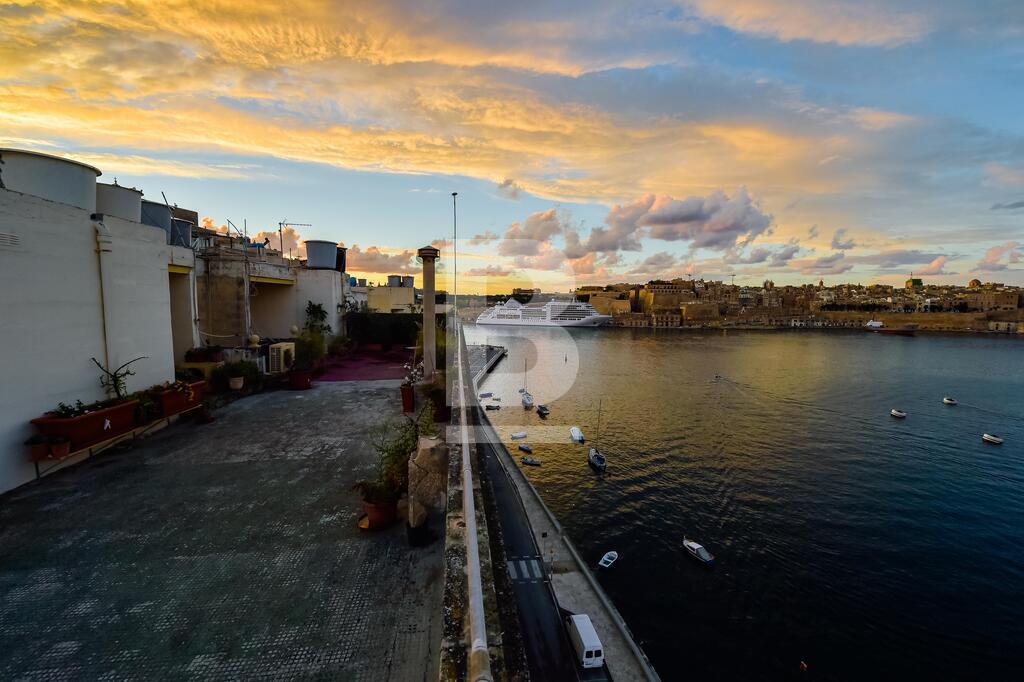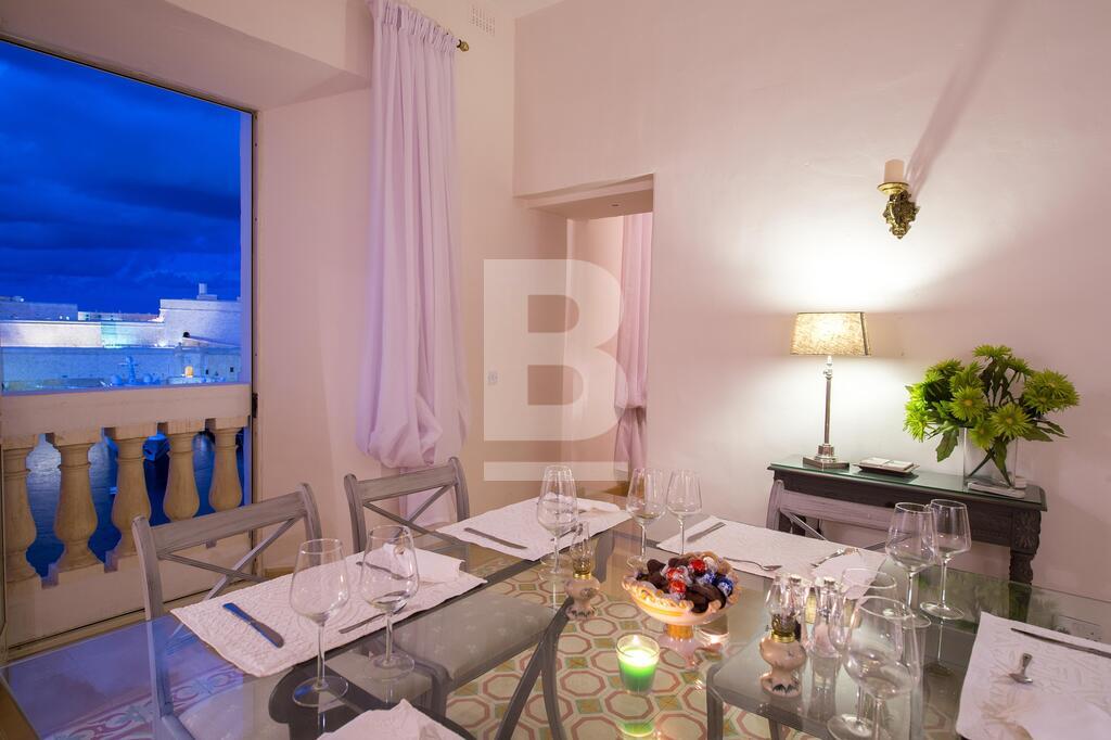A well converted top floor apartment situated directly over the sea with Fort St Angelo straight opposite and stunning views of Valletta and the Vittoriosa Marina. Property consists of a large sitting room part of which is used as a TV area with 4 balconies overlooking the harbour, separate dining room with seating for 8 and also with balcony and harbour views, fully-equipped kitchen, guest toilet, small closet in hallway, two double bedrooms with en-suites (1 with balcony overlooking the narrow streets of this town). Property is fully air-conditioned and includes, ceiling fans, a working fireplace in sitting room, 42 inch smart TV , telephone and Wifi installed, dishwasher, washing machine, shared roof garden enjoying spectacular views of Fort St Angelo, Valletta and Vittoriosa Marina and also with an area where one can dry laundry.