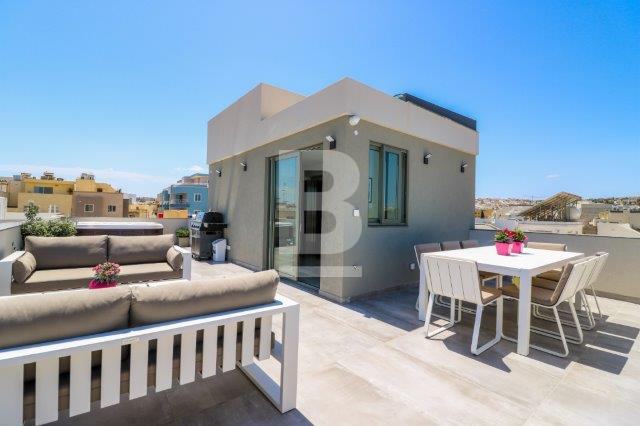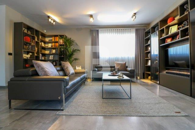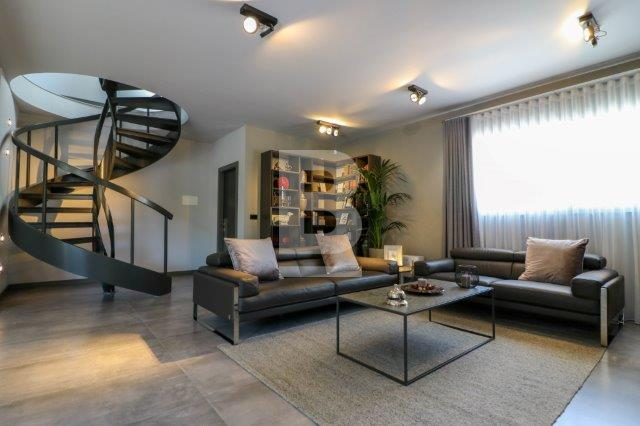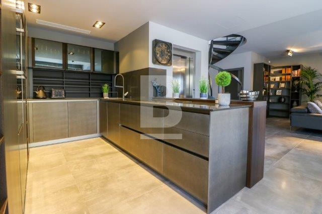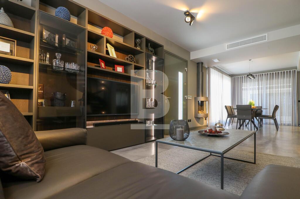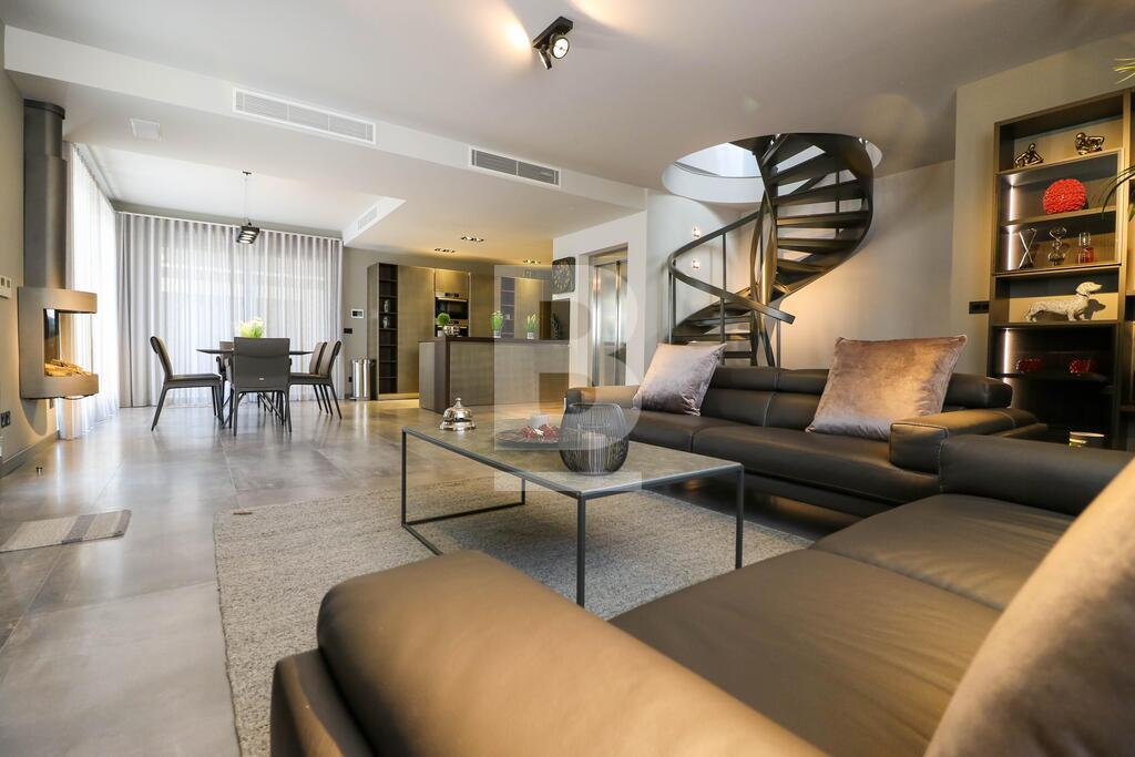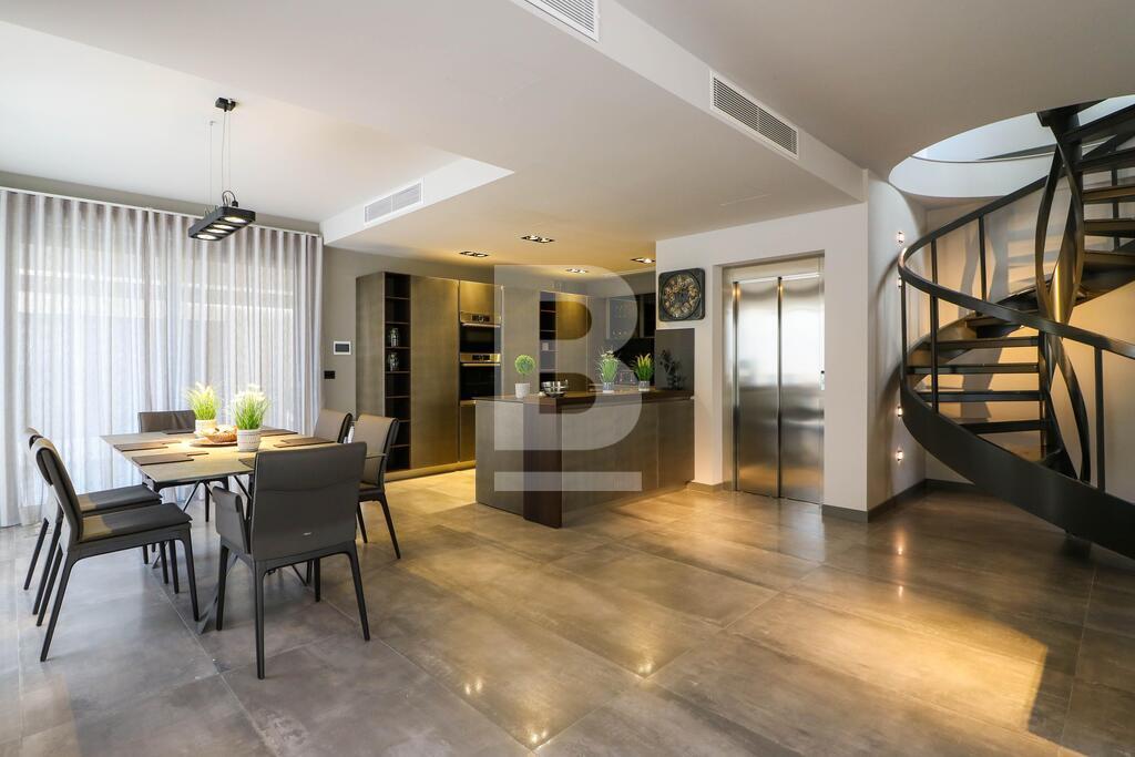 A beautifully designed villa in a residential area with an abundance of light comprising an open plan kitchen ,living ,dining room with fireplace , dishwasher , washing machine , tumble dryer , 3 double bedrooms with en suite , spare bathroom , a lift that leads to all floors and garage, A beautiful roof terrace with a large jacuzzi and designer outside furniture ,roof terrace also comes with its own kitchenette and bathroom and Bbq . 8 car garage with bathroom . Air conditioning units throughout .
