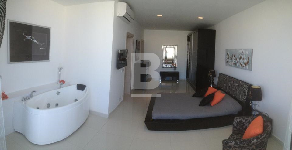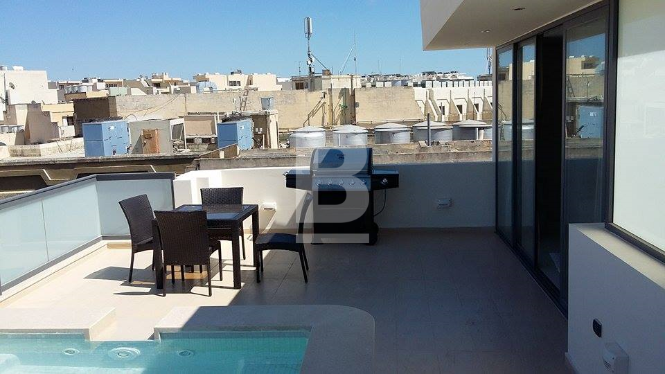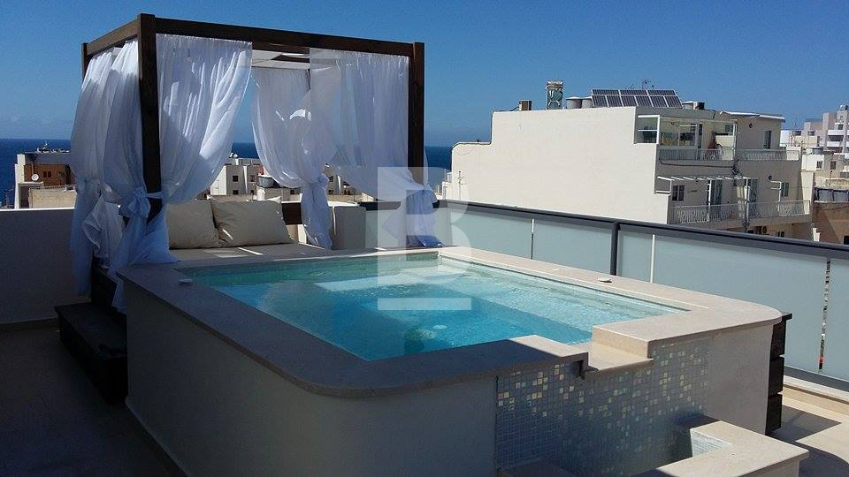Newly constructed and perched on the 6th floor of a modern building, a stunningly finished and furnished, luxurious penthouse, situated in a touristic area boasts incredible panoramas of St Paul’s Island. Spacious accommodation comprises of a kitchen / living / dining, surrounded by a large terrace with a Jacuzzi with waterfall, and a luxury sunbed cabana, outdoor dining table x 4 chairs and BBQ. In the bedroom you'll find a plush king-sized, flat-screen TV, a well sized closet and, a unique Jacuzzi bath, has floor-to-ceiling windows and terrace access. Property is being offered fully air-conditioned inverter and fully equipped designer finish furniture, gloss kitchen with best appliances, with a 55in Smart TV’s, a dishwasher, a washing machine and much more. It is also served with lift, intercom. Not to be missed. Well worth viewing.