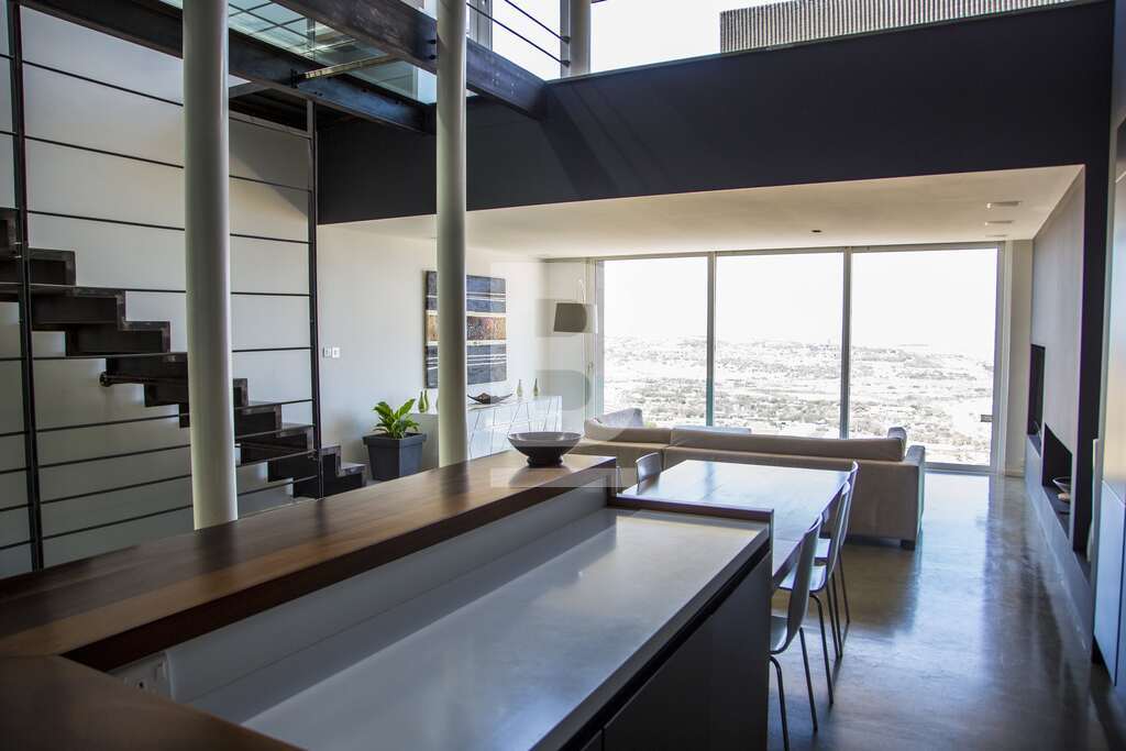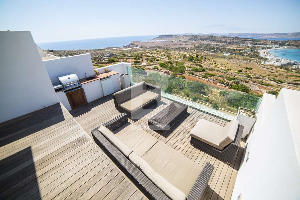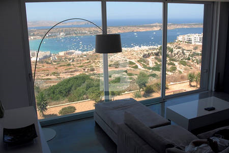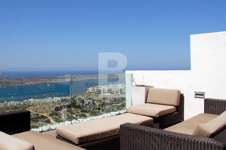 This Luxury Duplex Penthouse boasts possibly the best views in Malta. An architectural design project, this spacious residence offers it's tenants total comfort and special style. Every room has been designed to take advantage of this amazing view - even the large walk-in shower. Sheer breathtaking views of the Northern most tip of Malta, the Island of Comino and Gozo. This penthouse includes 2 double bedrooms, 2 bathrooms (main en-suite), living area and a large fully equipped kitchen and sushi style bar ideal for entertaining with the dining area integrated so as not to separate guests from the chefs. There is a large entertaining terrace with BBQ, Fridge and lounge area for up to 8 people in comfort. Amenities include: Automated home lighting,airconditioning throughout and all appliances.