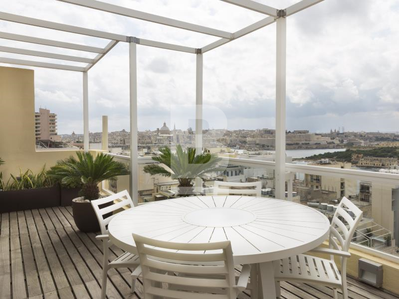 An 8th floor, 226 sqm apartment having the layout and the feel of a Penthouse. The property has 2 large terraces enjoying superb views, it is part of a smart bock of 9 located between the seafronts of Qui-Si-Sana and Tigne so it is close to the beaches, shopping centers, business hubs, bars, restaurants, ferries, etc.. Bright, spacious, and airy, accommodation comprises a wide central hallway, (fully equipped) kitchen/living/dining area with a large terrace enjoying sweeping views of Valletta, Manoel Island, and The Strand, 2 large double bedrooms share another large terrace also enjoying sea views, a 3rd twin bedroom, en-suite, a huge main bathroom, laundry room and guest toilet. The property is offered fully furnished and equipped, it also includes a fireplace in the living area, air-conditioning units throughout, a flat screen TV, a washing machine, a dishwasher, and more. A 2-car lock-up garage is available as an option. Must be viewed to be fully appreciated!
