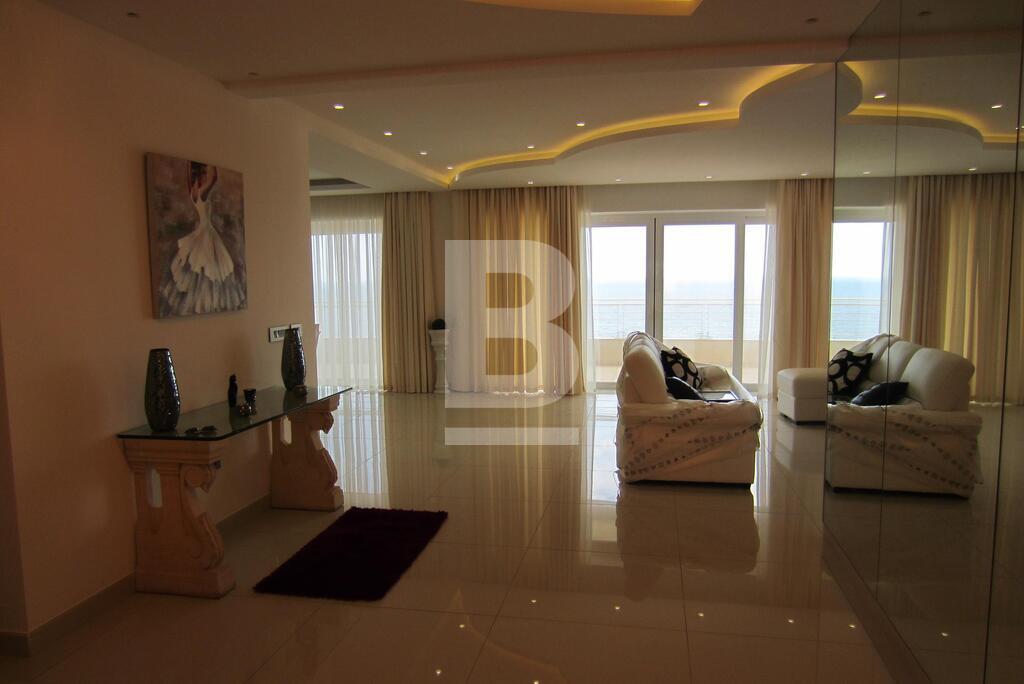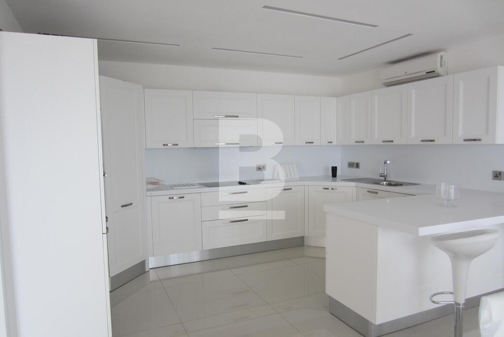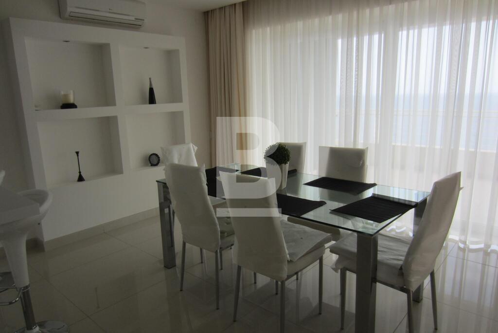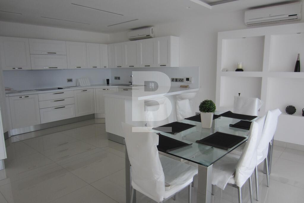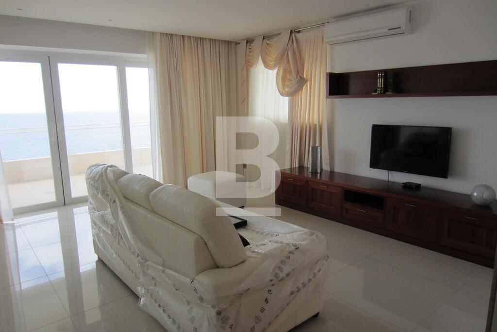 A fully furnished seventh floor luxury SEAFRONT APARTMENT forming part of this exclusive development enjoying exceptional views of the landscaping, the pool area and the open sea. Accommodation comprising entrance hall, large open plan kitchen / sitting / dining area leading onto a well sized terrace perfect for entertaining, 3 bedrooms (main with en-suite shower), 1 bathroom, guest toilet and 1 car space. Property is fully equipped with air-conditioning units and also includes washing machine/dryer, microwave, dishwasher, TV and use of pool area.