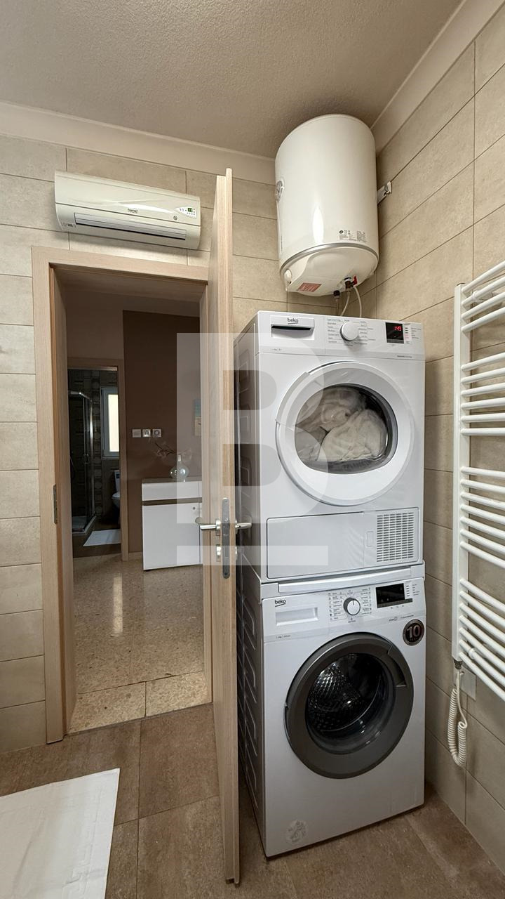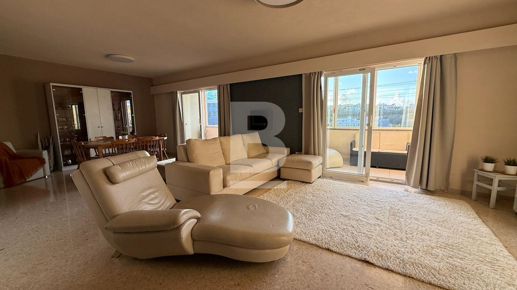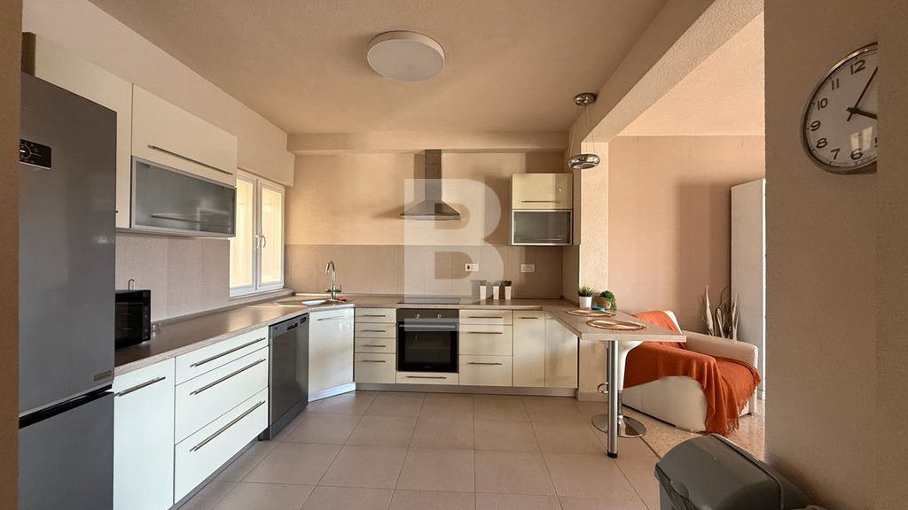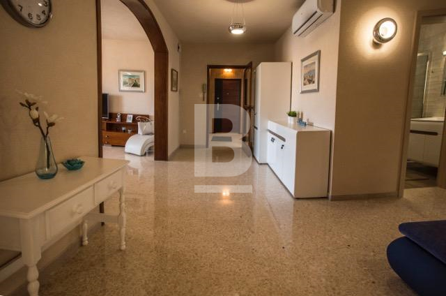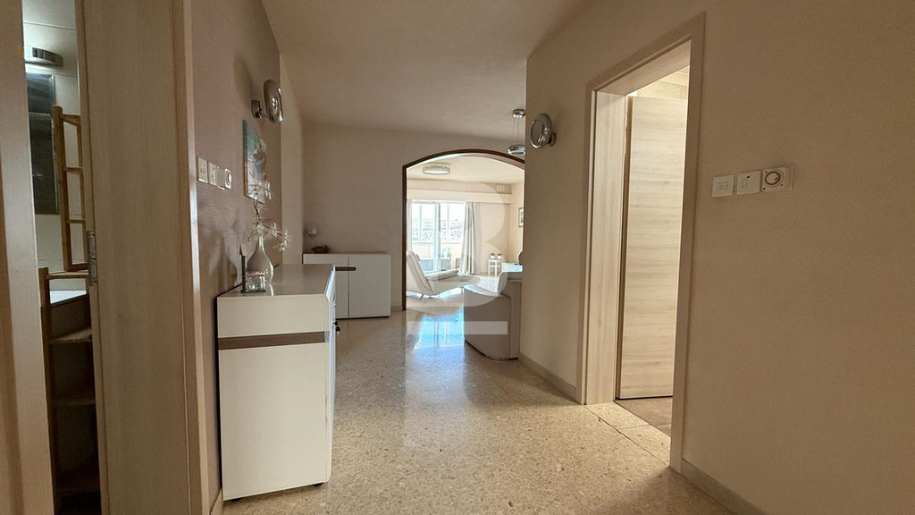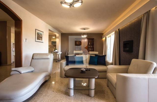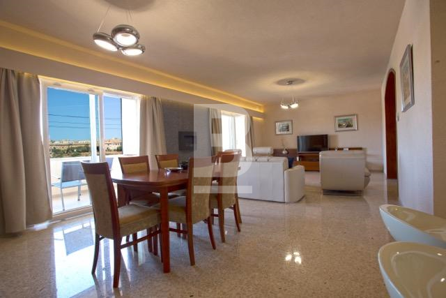 Fully furnished first floor 140 sqm seafront apartment situated within a residential complex with security and private parking facing the lovely blue flag sandy beach in St. George’s Bay. Bright and spacious accommodation comprises a welcoming entrance with cloak room, wide hallways, large sitting / dining room leading onto a large closed terrace enjoying fantastic open views and having with its own dining / lounge area, interconnecting kitchen, 2 double bedrooms and 2 shower rooms. This property has recently been totally refurbished to the highest standards (graffito walls, PVC apertures, trendy bathrooms, etc.). It is a lovely home or a premium rental investment sleeping 6 persons. Offered fully furnished and equipped. Viewing is highly recommended.