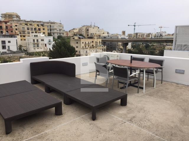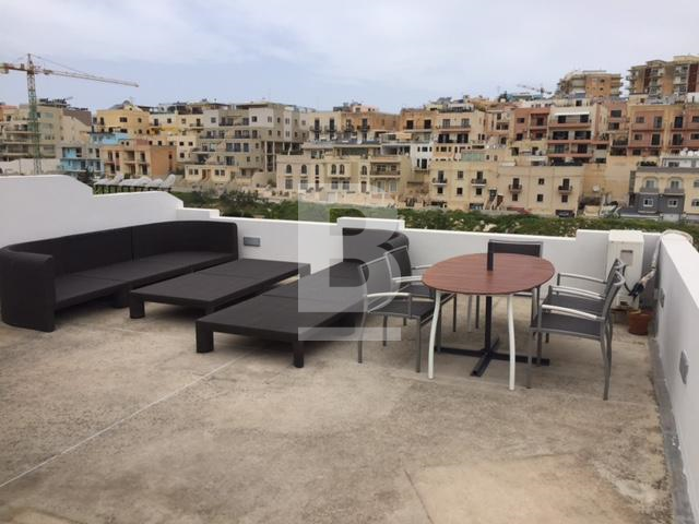 Second floor, furnished semi-detached maisonette with roof terrace for long let. A bright second floor semi-detached maisonette with full use of roof., spacious and located only five minutes walk from Spinola Bay. It consists of 3 bedrooms, a study (or extra bedroom) and two bathrooms. A modern and well equipped kitchen leads into the lounge, dining room and terrace with valley views. The roof terrace is the same size as the floor below and includes a living area with doors leading to the outside BBQ area - ideal for entertaining.The property is located in The Village, St. Julians, with gorgeous open views of the valley. A one car garage is also included in the price.