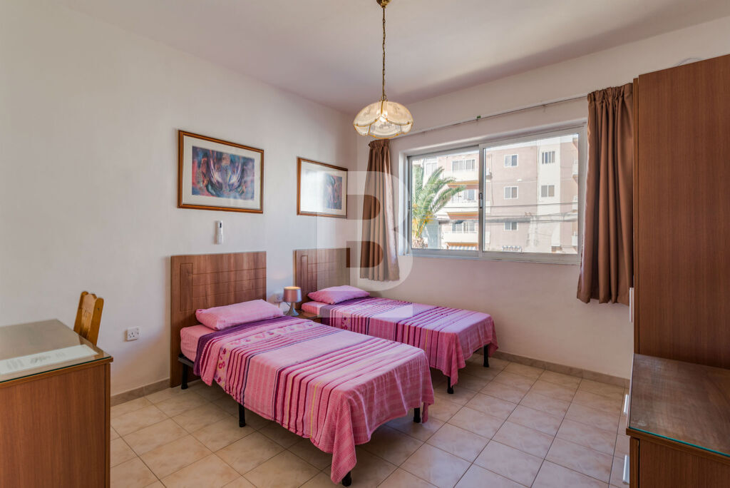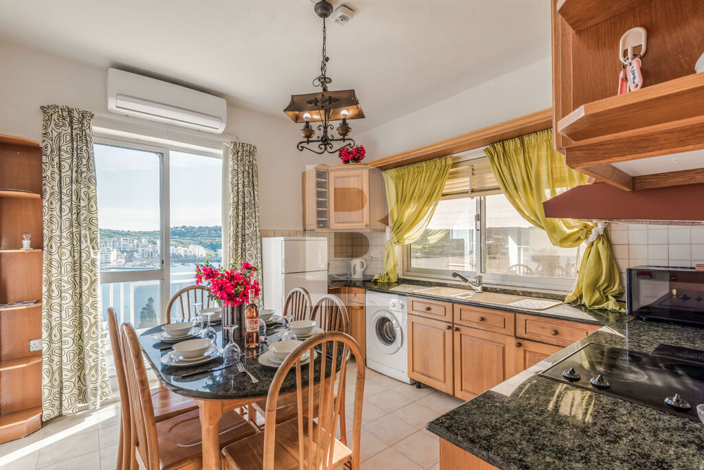 Bright and sunny 2 bedroom apartment with great sea views in a quiet area. The Apartment enjoys views of all the bay from the large outside terrace, kitchen and sitting room. It is South and West facing and therefore enjoys sun most of the day. This apartment is fully air-conditioned (hot and cold) and has all the commodities and all you need for any necessity. The kitchen is well equipped with oven and 4 hobs, microwave and big fridge freezer. The terrace is equipped with gas BBQ and garden furniture. The apartment comprises of two double bedrooms with space for extra beds, bathroom, shower room. The living room is lockable and may be used as a spare bedroom if necessary and 2 extra beds are available. A roof terrace is included with this apartment and deck chairs are also provided. The Bay view semi-detached apartment is located 20 steps up to the 1st floor with no elevator.