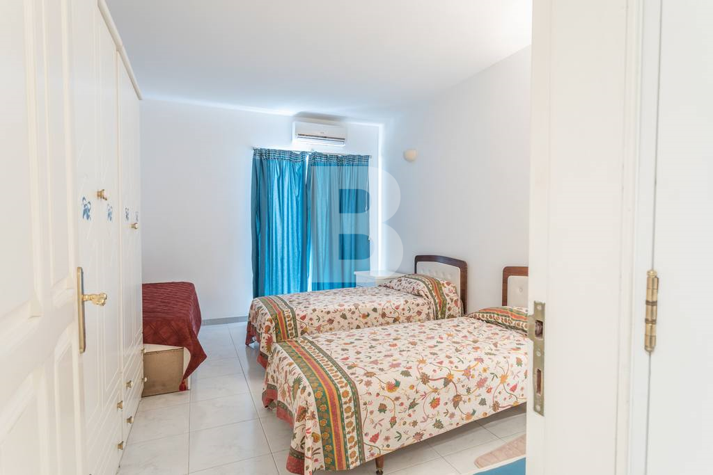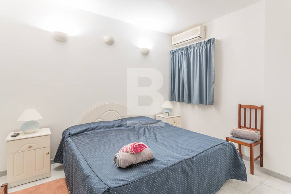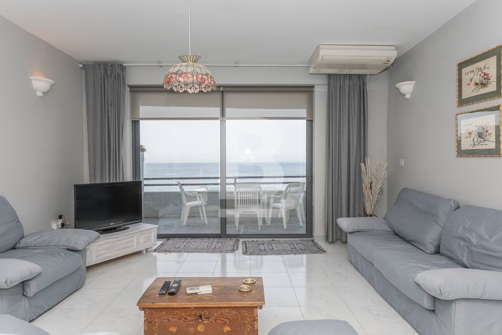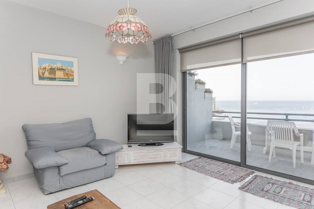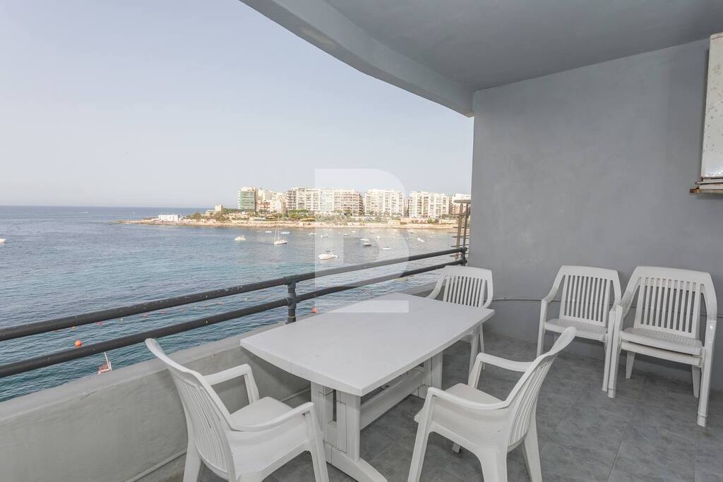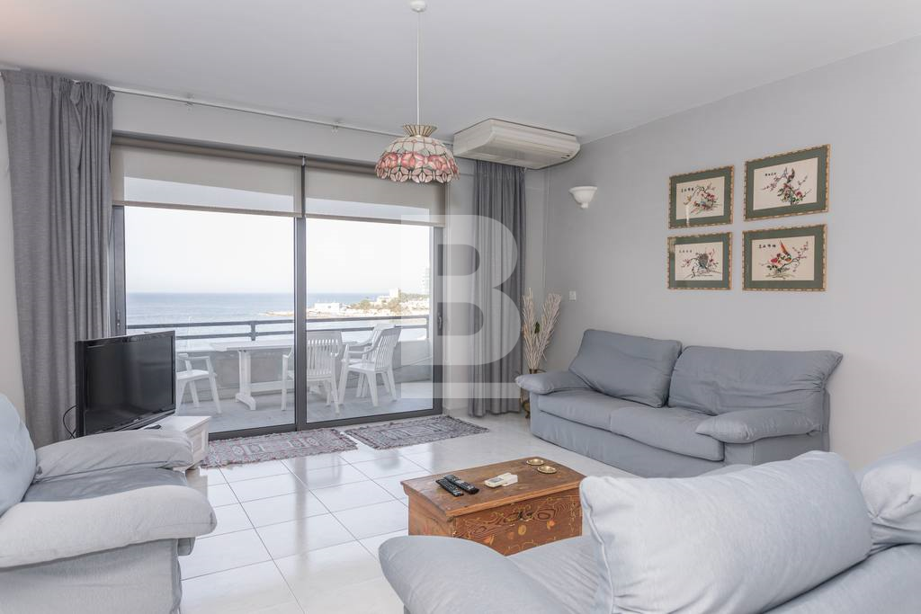 A beautiful, spacious, 2-bedroom apartment right on the sea front on the St Julians promenade with exceptional views. This apartment is located in the centre of activity, with a large number of restaurants and coffee shops close by, transport links, shopping, eating out, beach-facilities.This apartment is situated on the fifth floor served with lift. It has a good size entrance-hall which flows into the very spacious dining and sitting area. This living area opens onto to a terrace, deep enough for eating and lounging. There is a separate large kitchen/breakfast with breakfast bench and is fully equipped with oven, microwave, hob, washing facility, and dishwasher. The apartment has two spacious double bedrooms (main with en-suite shower) and main bathroom. Property is fully air conditioned. All main spaces, (bedrooms as well as the sitting/dining area) have split air-conditioning units.