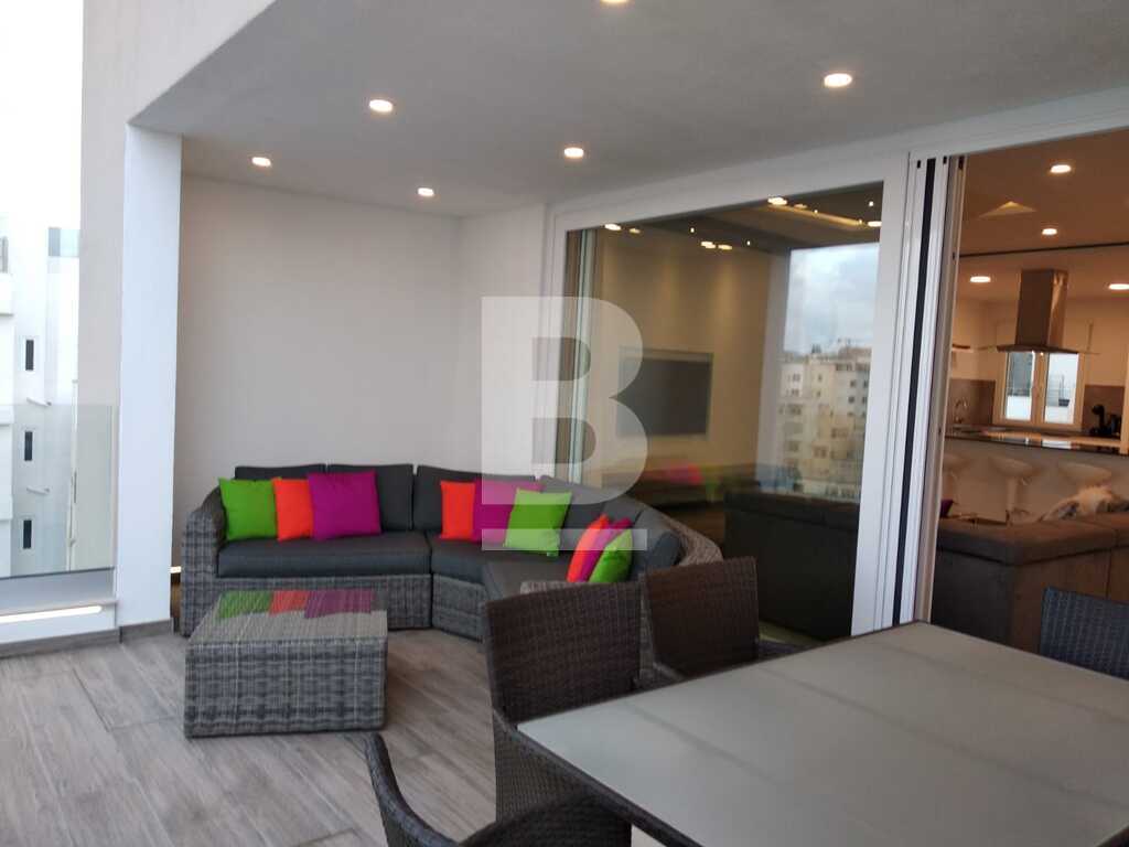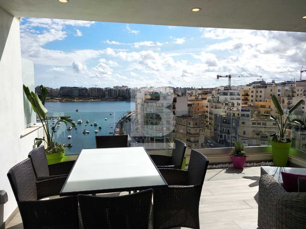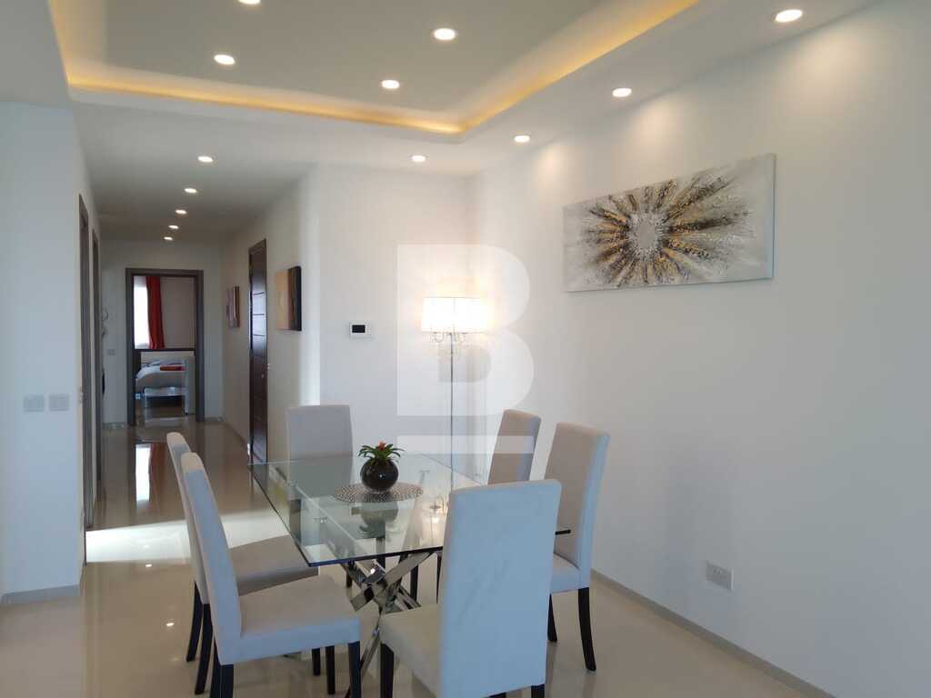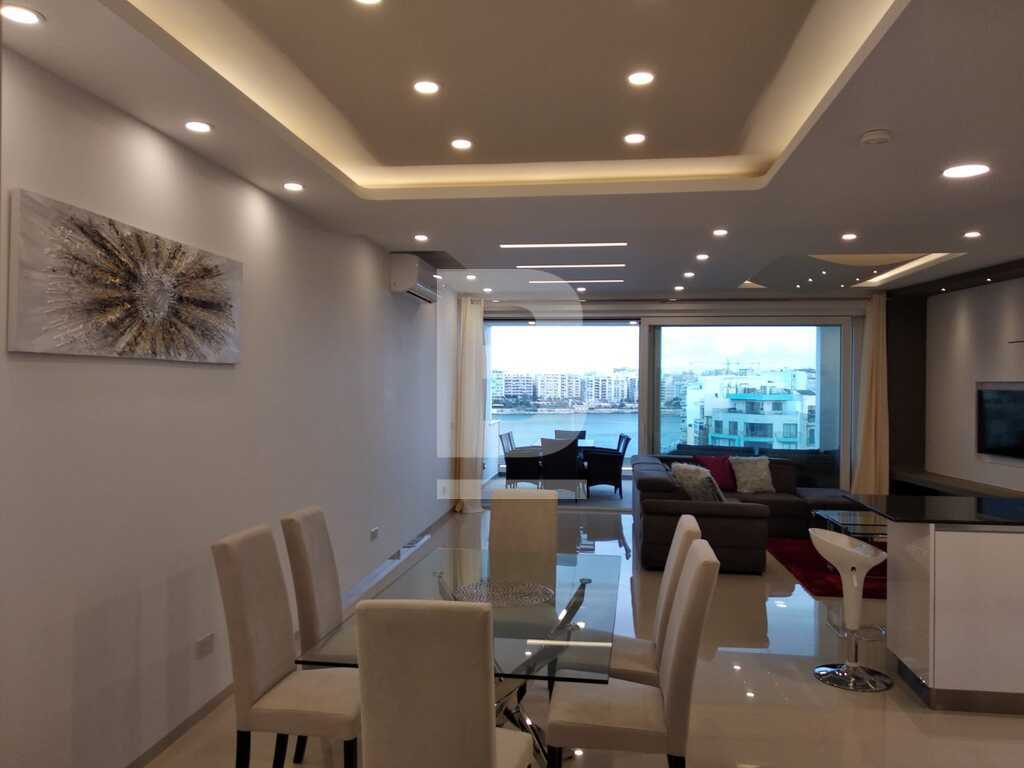 A lavishly designed 4th-floor apartment comprising an open living/dining/kitchen area leading to a sizeable dining veranda overlooking the amazing view of Spinola Bay. Situated in a very central location near restaurants, main hotels, casinos etc. Fully fitted kitchen with electric oven/hob, fridge/freezer, microwave and a wine cooler. Large sitting/dining room with L shaped couch, plasma TV and internet and property is equipped with A/Cs throughout. Fully insulated walls and floor that keeps the property very comfortable throughout the year. Accommodation consists of a main bedroom with en-suite facilities and a twin bedroom. There is also a laundry room with storage space. An optional garage space is available.