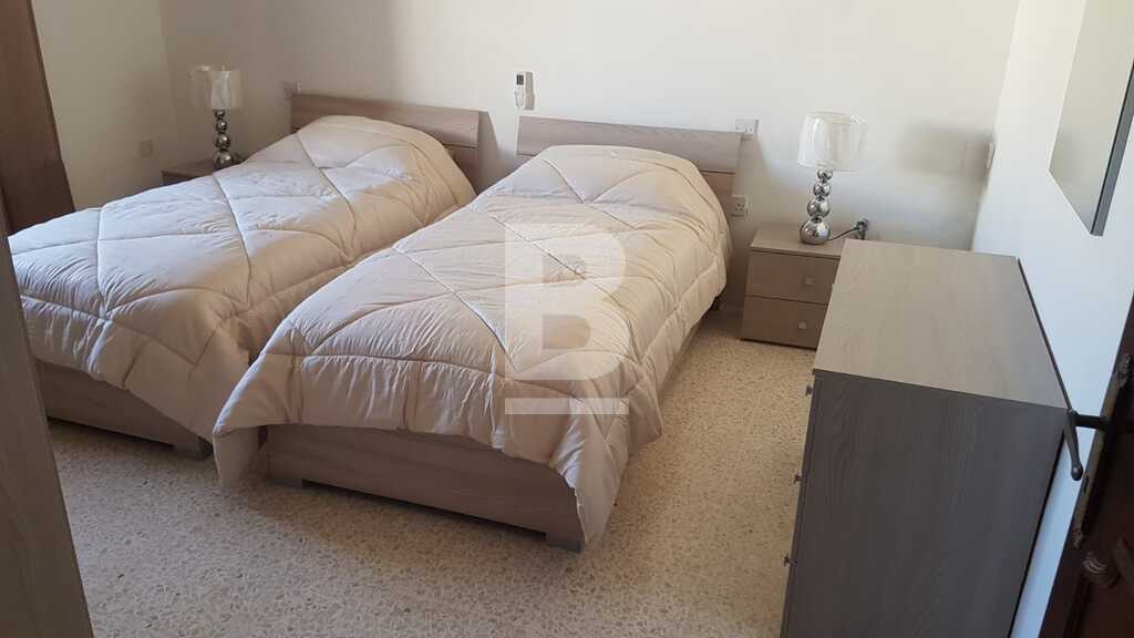 Bright, modestly finished APARTMENT in the quiet area of Ta Giorni, close to the Libyan School and public transport. Property consists of a separate kitchen & dining room leading to a back balcony over looking a private garden, main bathroom (bath tub), 2 double bedrooms (one of them has 2 twin beds), and a sitting room leading to a front balcony. Brand new furniture except for the bathroom, fully AC, located on the 1st floor and not served with lift.