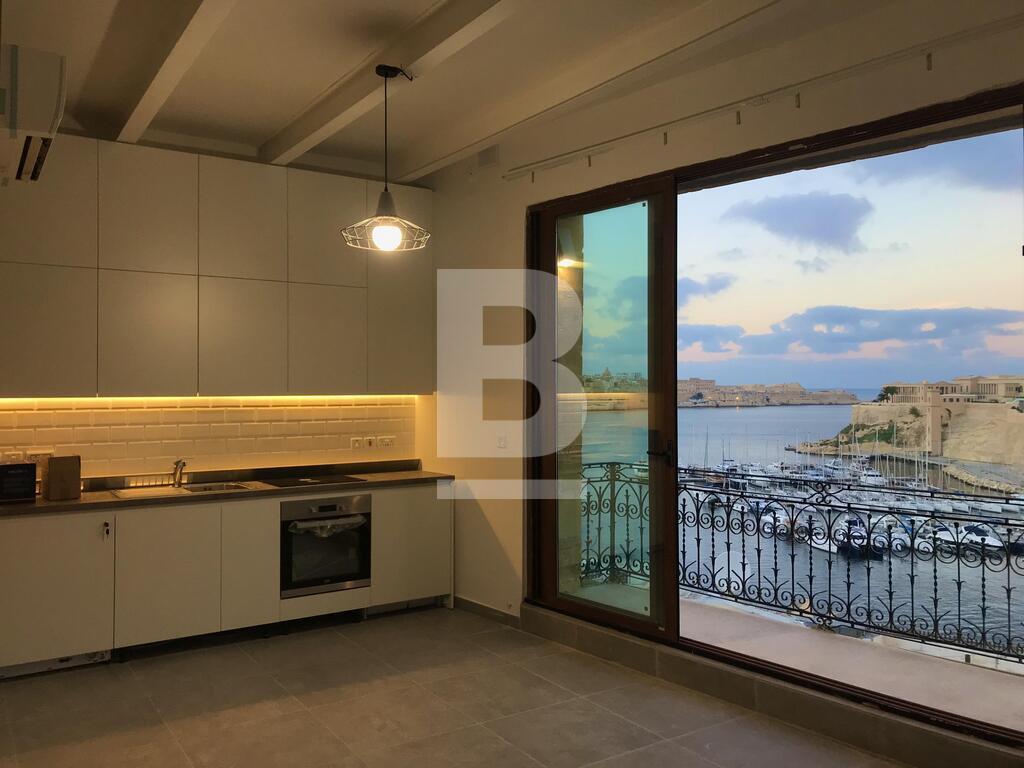 Brand new 4th floor modern seafront apartment with excellent views situated in the grand harbour of Malta in the three cities, Birgu. Close to many shops and restaurant amenities, apartment consists of an open plan kitchen/living/dining area, a front facing balcony, main bathroom, study area, one large double bedroom and use of roof. Property offered fully furnished including washing machine, AC's throughout, security features and CCTV.
