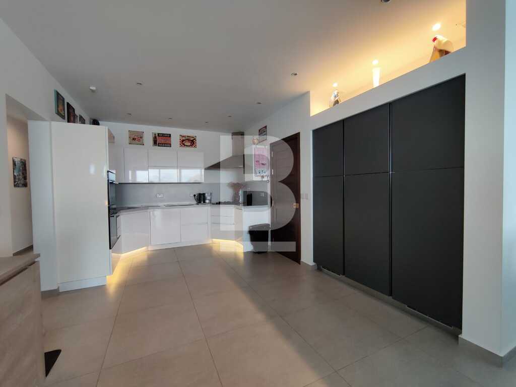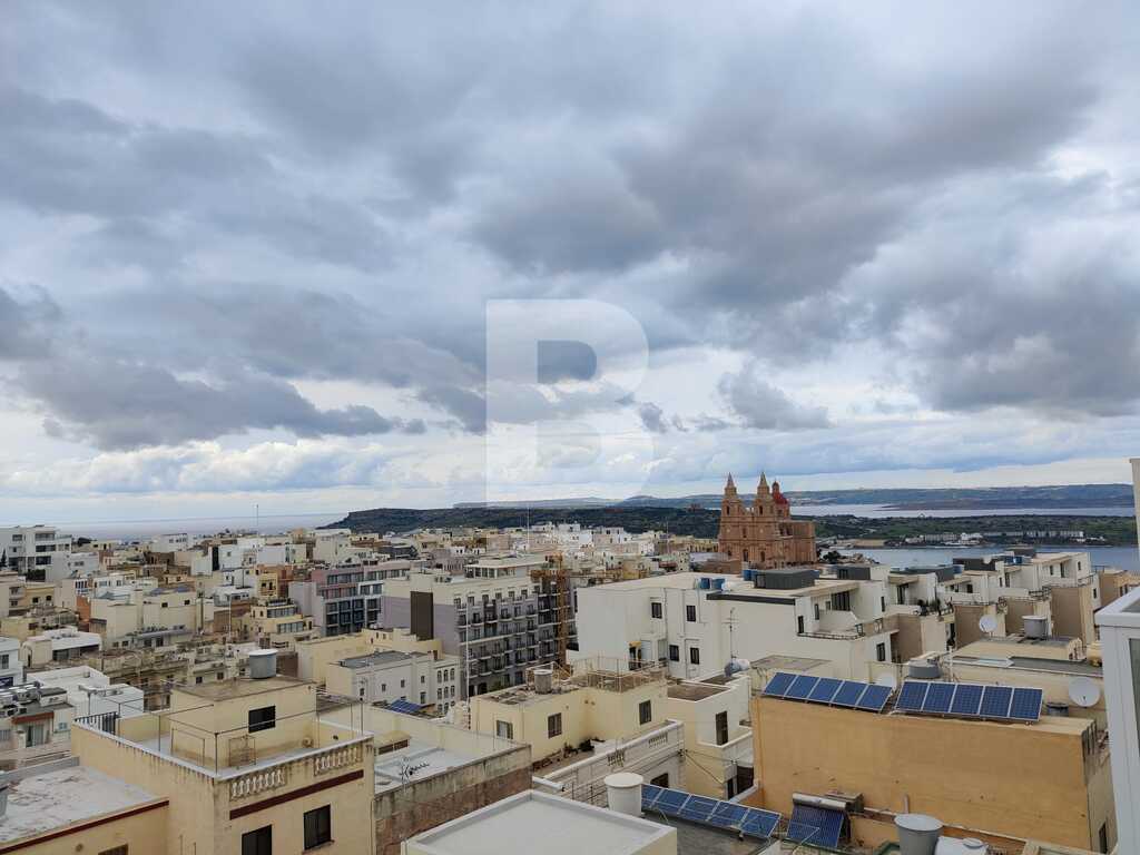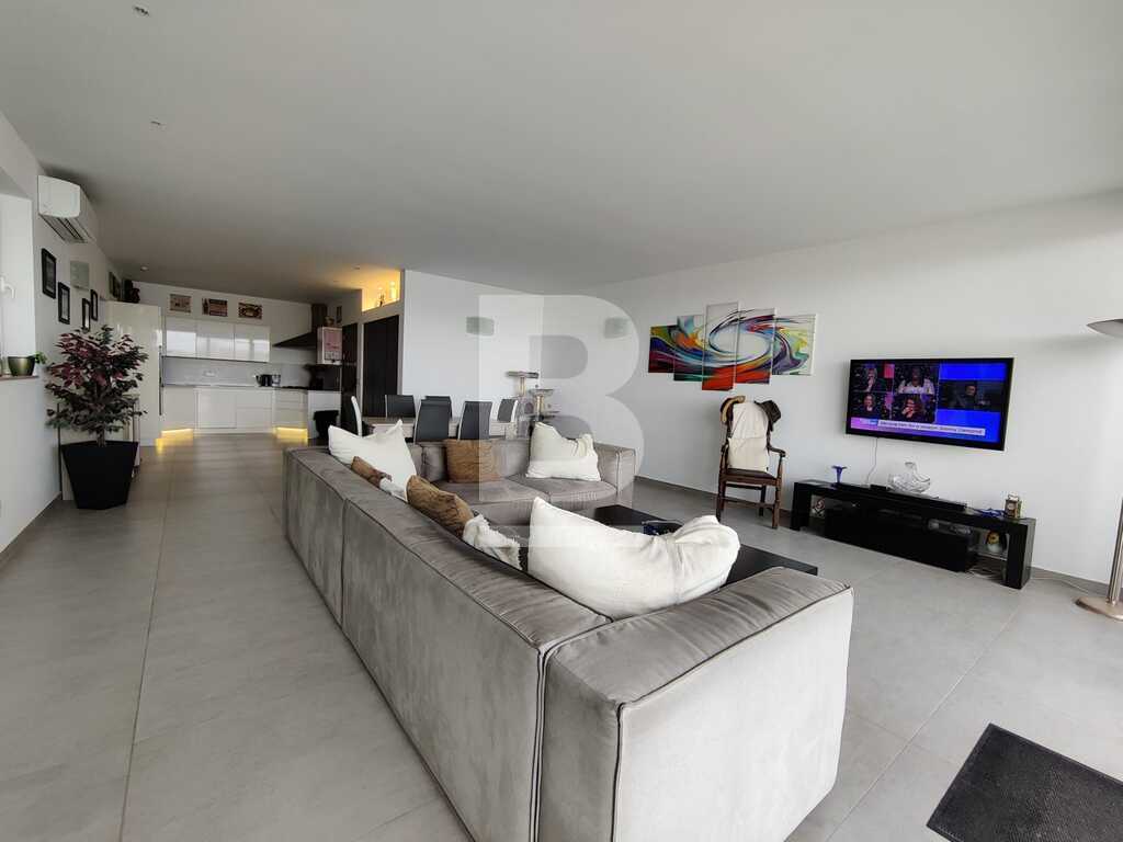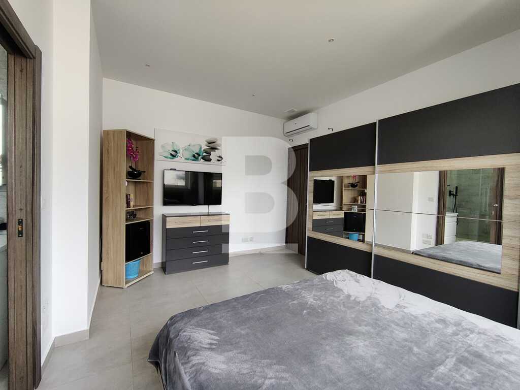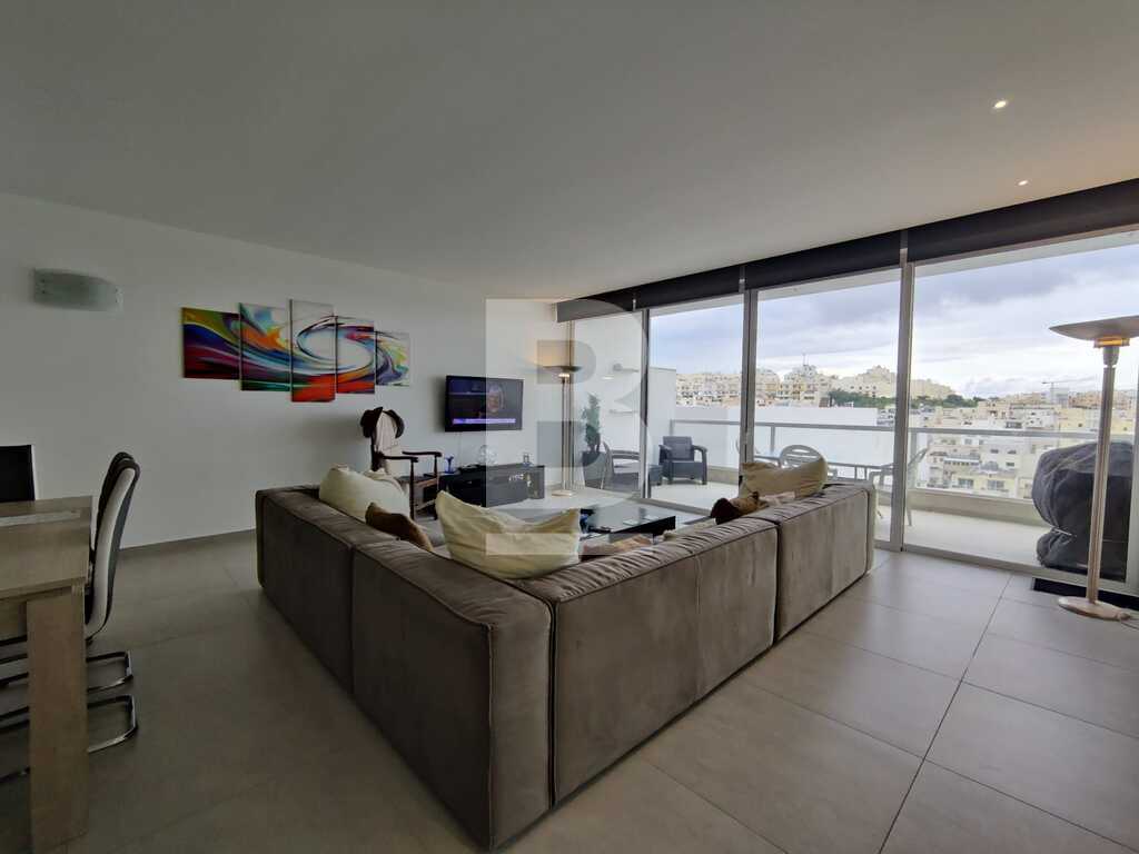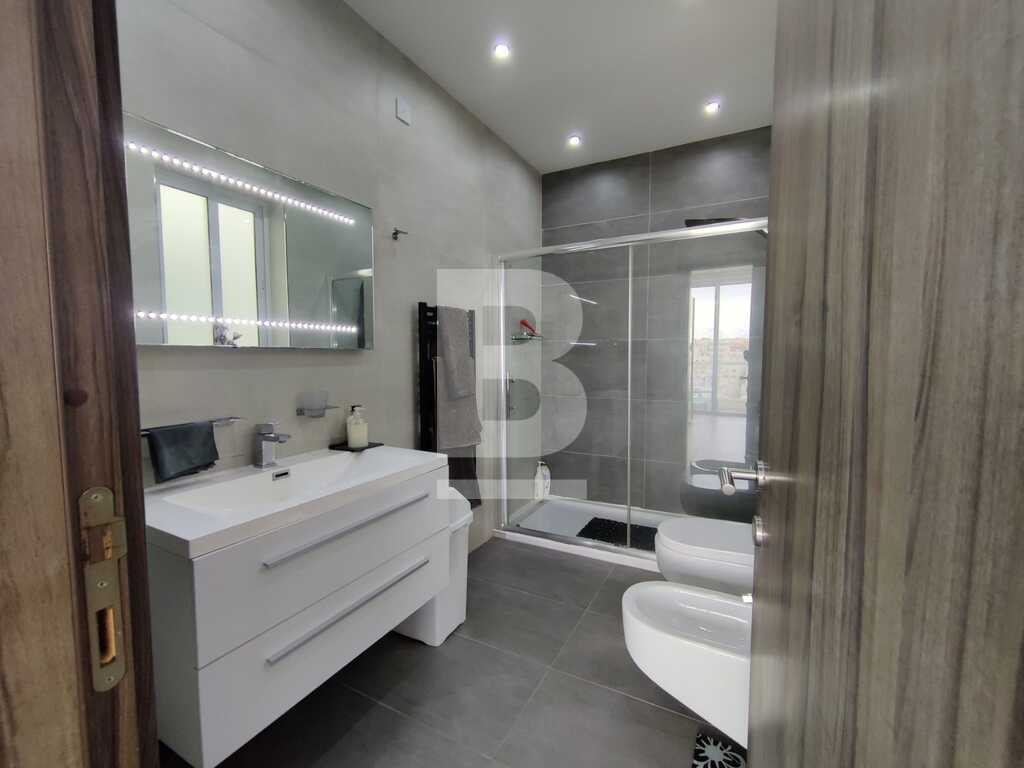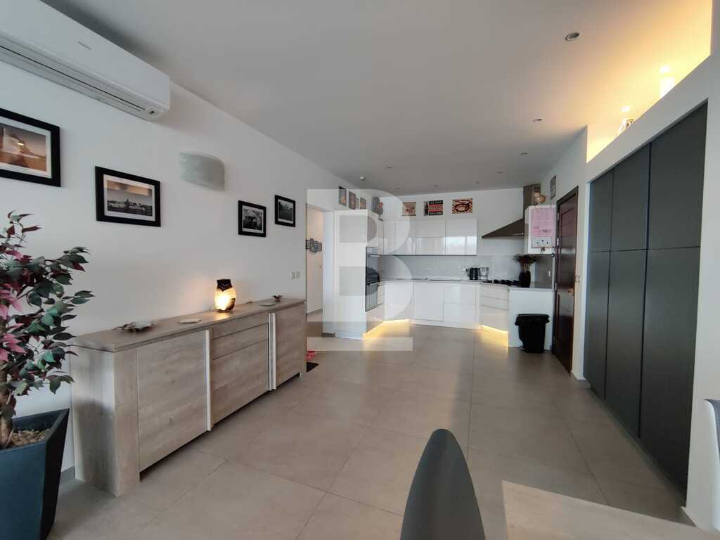 Modern, highly finished and fully air-conditioned, second floor apartment in a block of 3 units and served with a lift. Layout comprises of a large open-plan kitchen/living/dining with a large and equipped front terrace having open sea views, a main bedroom with an ensuite shower room and front terrace, main bathroom equipped with a bath tub and shower, box room, another 2 double bedrooms (one with an ensuite shower room and the other with a back balcony).