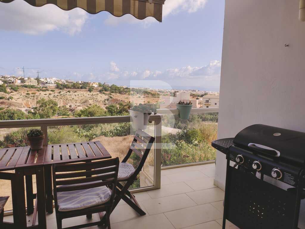 Located in a lovely area of San Gwann, enjoying open country views and distance sea views from it's spacious fully furnished with outdoor furniture terrace. Upon entrance one is welcomed by a cosy living room having an open plan layout with the fully equipped kitchen complete with Bosch appliances, reverse osmosis, dishwasher and energy saving appliances. The sleeping quarters comprise of two bedroom and two bathrooms. Complimenting this property is an interconnecting car space. This property is fully air conditioned and would make a lovely home for a young family or professionals wanting to reside in a quite yet central area.