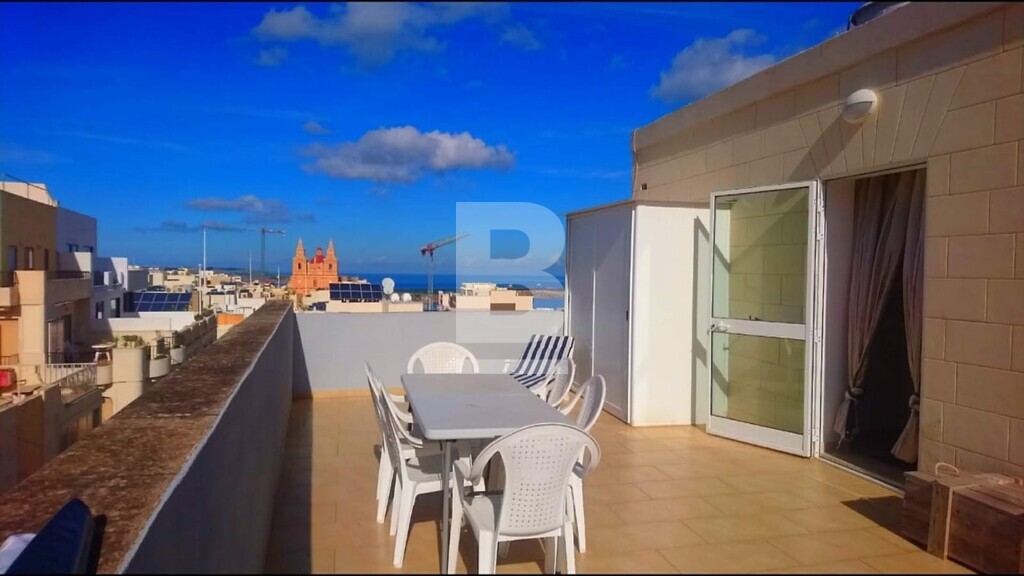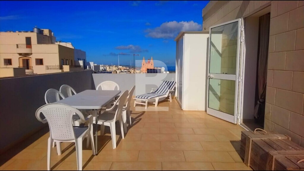 A Penthouse located in the centre of Mellieha, forming part of a modern block, within walking distance to all amenities. This property comprises an open plan kitchen/living/dining layout, leading onto a front large 30 sqm terrace ideal for entertaining with distant sea views. 2 double bedrooms and back balcony, 2 bathrooms, This apartment is fully furnished and serviced with lift and includes washing machine, microwave, fridge & TV. Good value property!