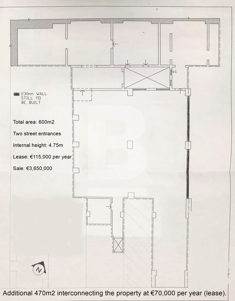A large mostly open commercial space being offered for lease or for sale. Having two separate street entrances and multiple parking and loading bays, the layout consists of a large atrium like space with internal height of 4.75m, four large rooms which may be interconnected, a central courtyard and toilet facilities. Located in a very good part of Floriana, adjacent to numerous reputable company offices and just of the main road the property may be ideal for most commercial uses including offices, a logistics centre, a supermarket, a commercial garage, light industry, warehousing, catering, a fitness centre etc. The property may also be extended by an additional 470sqm. The internal height may also be increased considerably if required. Very unique commercial qualities and location.