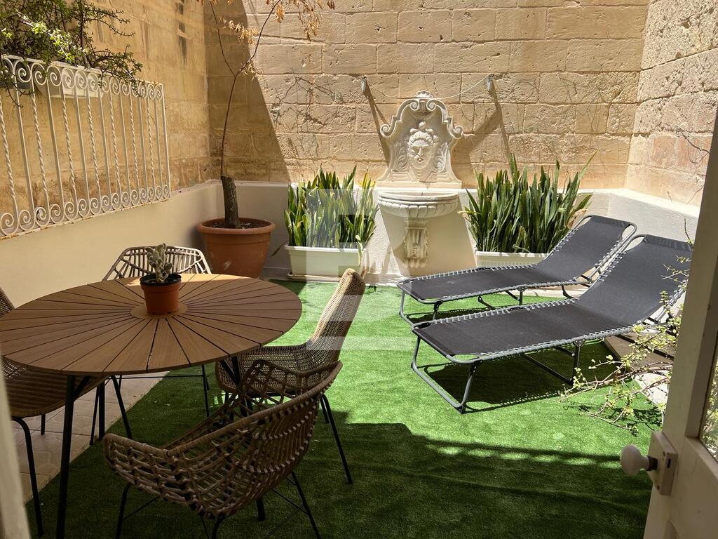 A beautifully finished and tastefully furnished three story townhouse situated in the heart of Sliema just of seafront promenade and all its amenities. It opens on a welcoming entrance hall with two separate sitting areas, guest toilet, separate kitchen/b’fast area leading to a backyard offering an abundance of natural light. The second floor consists of two double bedrooms both with a balcony and two bathrooms The master bedroom with en-suite shower room is located on the third level also with a balcony and a study with good size terrace. Property is fully air conditioned and is equipped with TV, washing machine and much more. Viewing is a must.