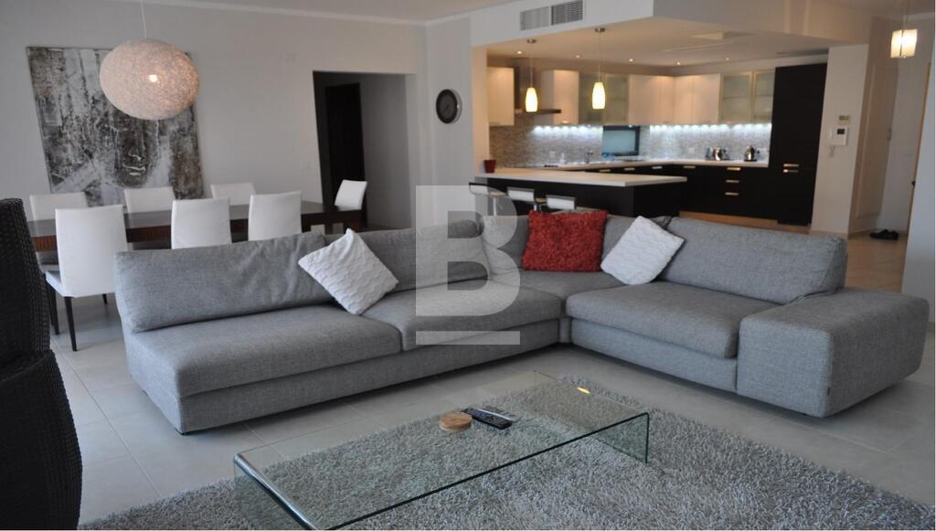 Situated in one of the most prestigious residence block in St Julian's, is this second floor luxury furnished corner apartment having an area of about 150 square meters and consisting of an entrance to a spacious open plan with fitted and fully equipped kitchen, dining and living area leading onto a wide sunny back terrace, a wash room, main bathroom, box room, two double spare bedrooms and master bedroom with en-suite and balcony. This modern furnished property features air-conditioning throughout the apartment, LCD TV, washing machine, dishwasher. Also complimenting the property are 2 car spaces and lift accessible from garage level.