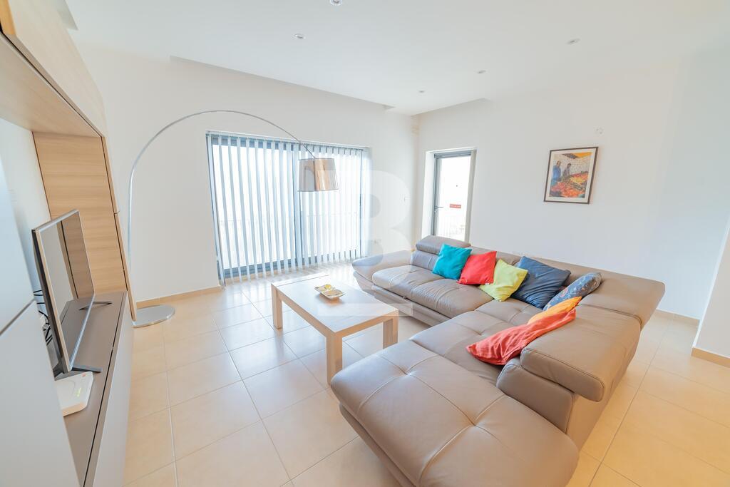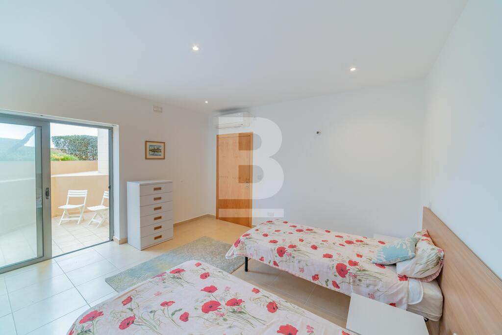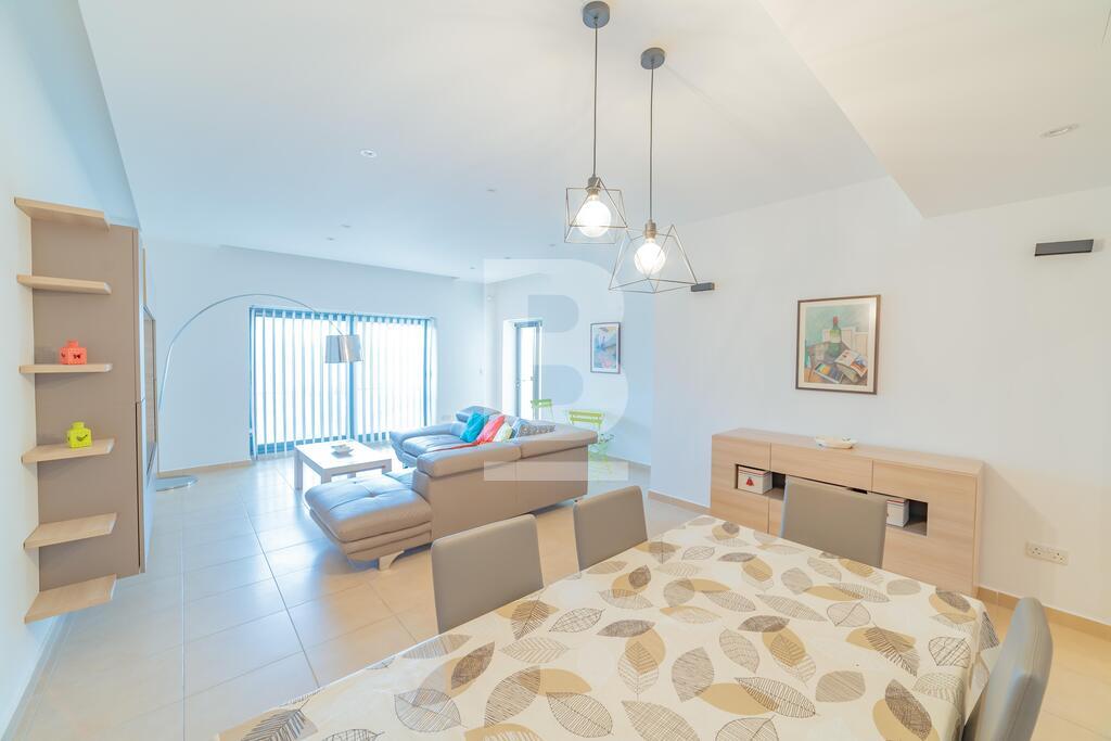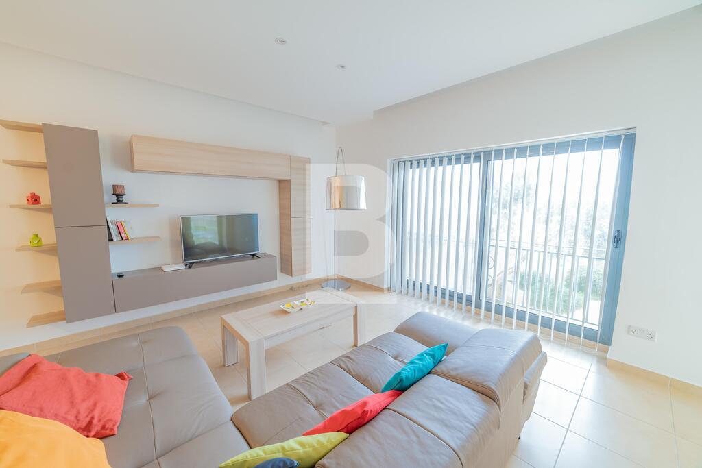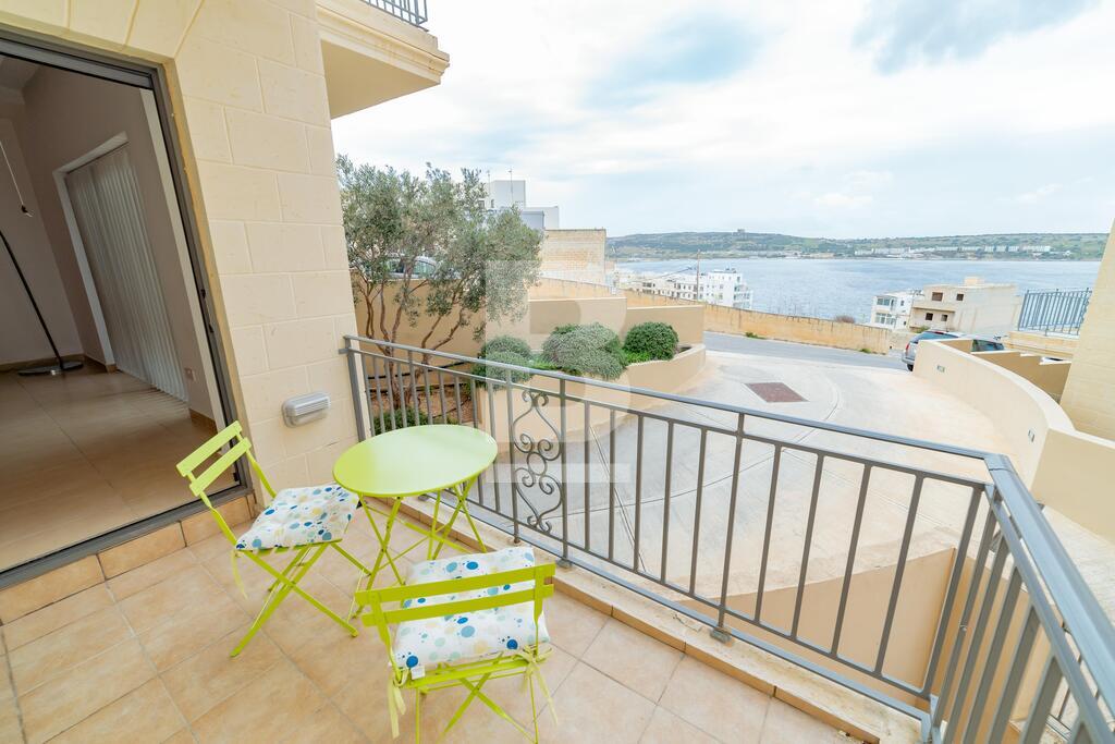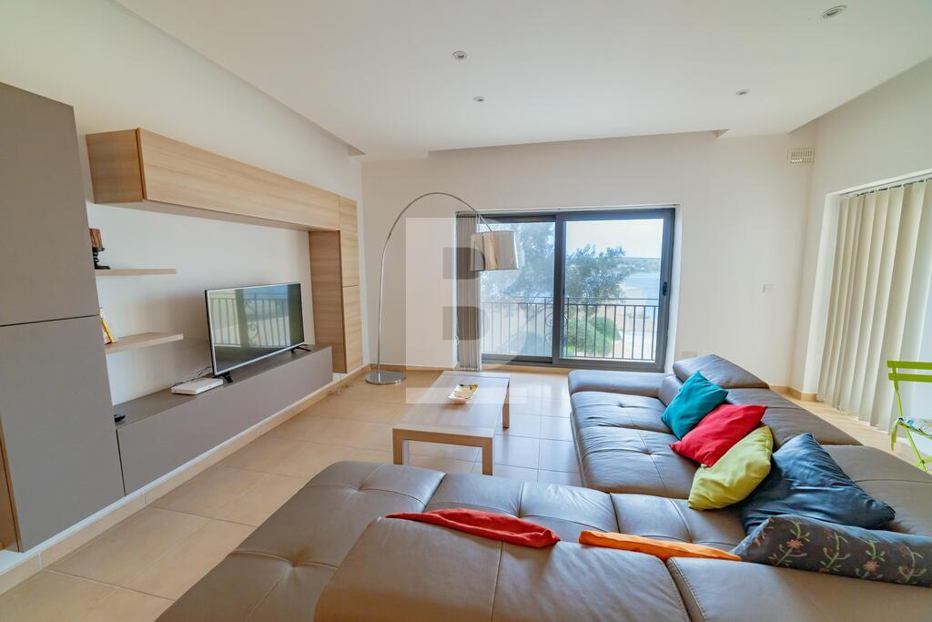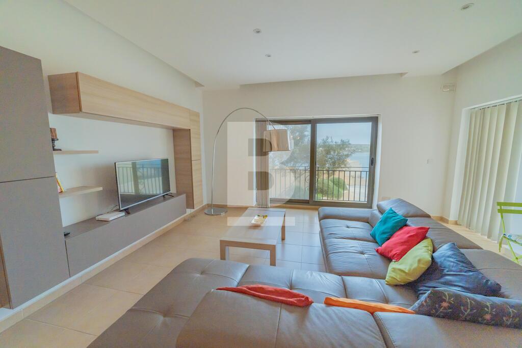 Lovely seafront apartment, with front terrace enjoying panoramic sea views and forming part of the prestigious Tas-Sellum Residence, attractively furnished and offering use of the communal swimming pool. Property comprises a separate kitchen area, spacious living/dining area, one double bedroom (with en-suite facilities), one twin bedroom, main bathroom and back yard. Property is equipped with air-conditioning throughout, flat screen TV, dishwasher, washing machine, microwave and includes 1 lock up garage.