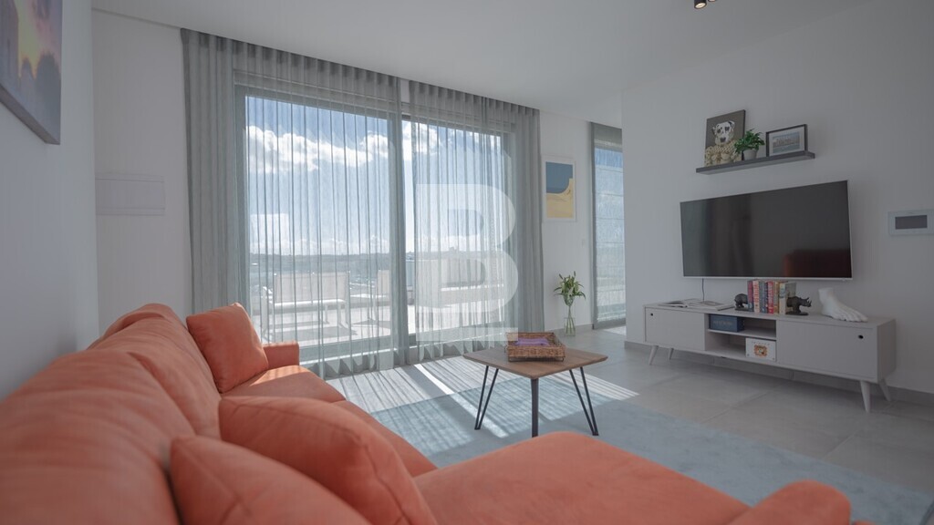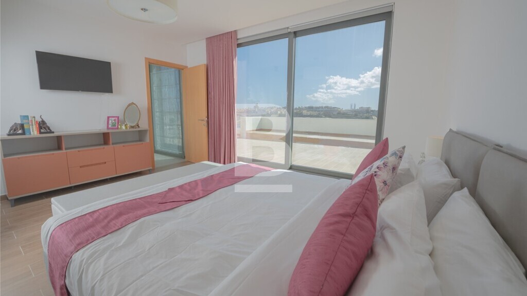 A 1 bed , 8th floor , sea view apartment approx. 100 sqm open plan kitchen, living, dining room leading onto a terrace with breath taking sea views and views of Valletta. One double bedroom, 1 spare bathroom, 1 toilet, and a washroom. Washing machine and tumble dryer, fitted wardrobes and air-conditioning units throughout. Property comes served with lift as well as a two car garage (optional) and forms part of a luxurious block including security cameras.