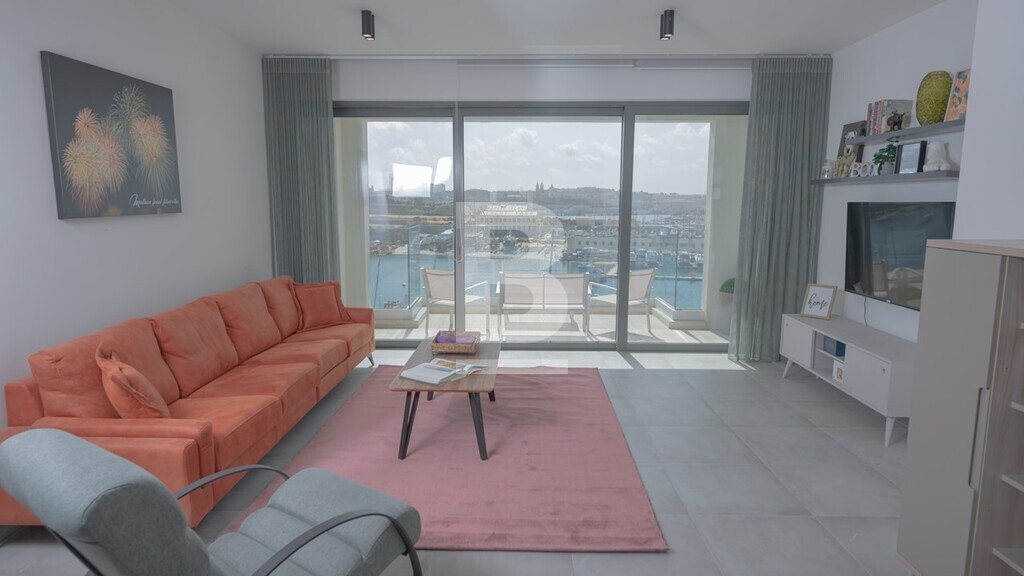A large, bright and airy seafront duplex apartment on two floors of 145 sqm on the 7th and 8th floor centrally located and close to all amenities. This apartment consists of a fully fitted and equipped kitchen, dining area, and a living room, 2 double bedrooms, a main bathroom, and a guest toilet. This property enjoys spectacular views of Valletta from a large front terrace on both floors. Washing machine and tumble dryer, fitted wardrobes and air-conditioning units throughout. Property comes served with lift as well as a two car garage (optional) and forms part of a luxurious block including security cameras.