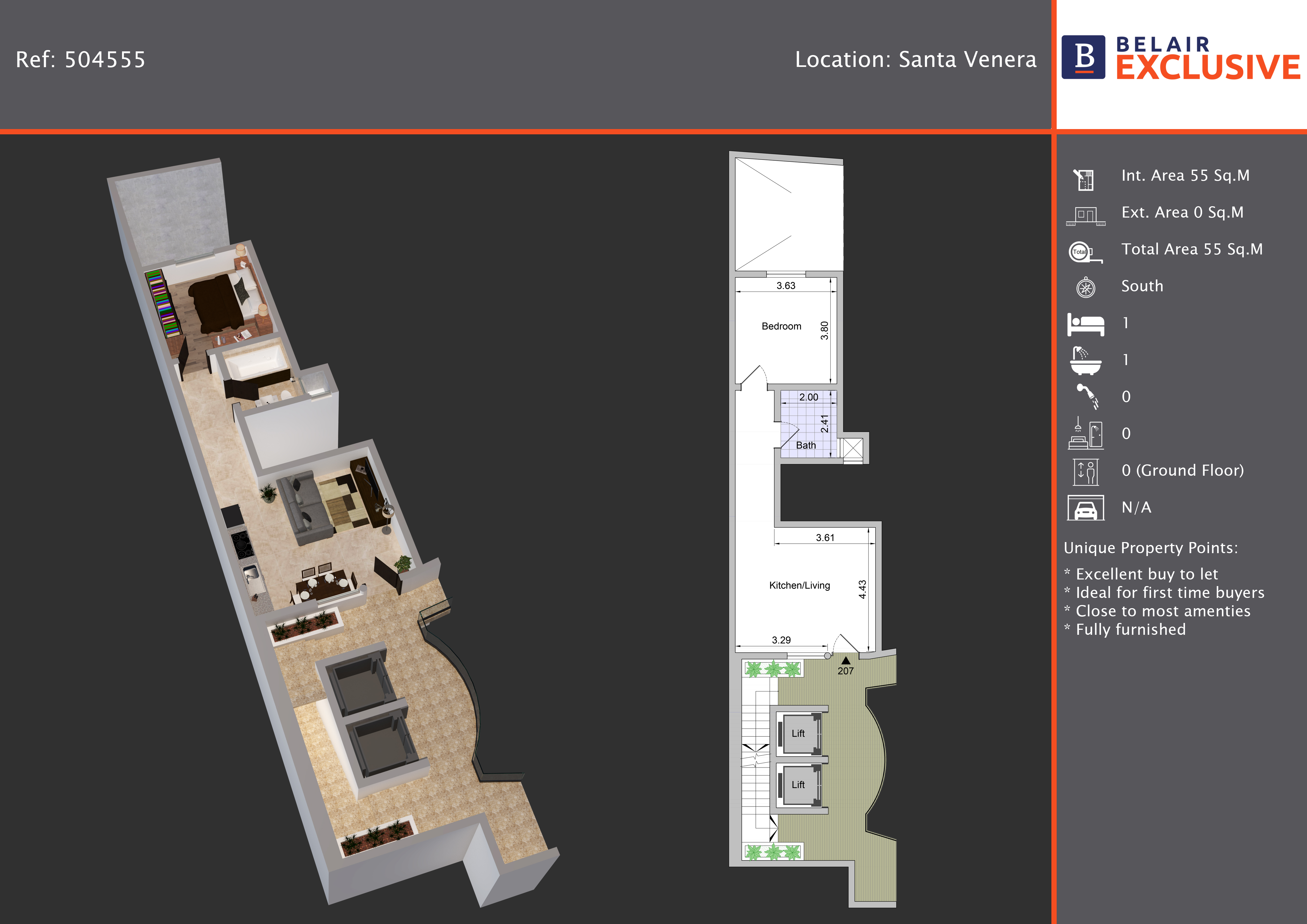 Spacious, highly finished and fully furnished one bedroom apartment forming part of a smart modern block situated in a quiet residential area and within walking distance to all amenities. Property comprises an open plan fully equipped kitchen / living / dining area, one double bedroom and main bathroom. This property if fully air-conditioned and includes TV, induction hob, washing machine, lift and intercom. Viewing is highly recommended!