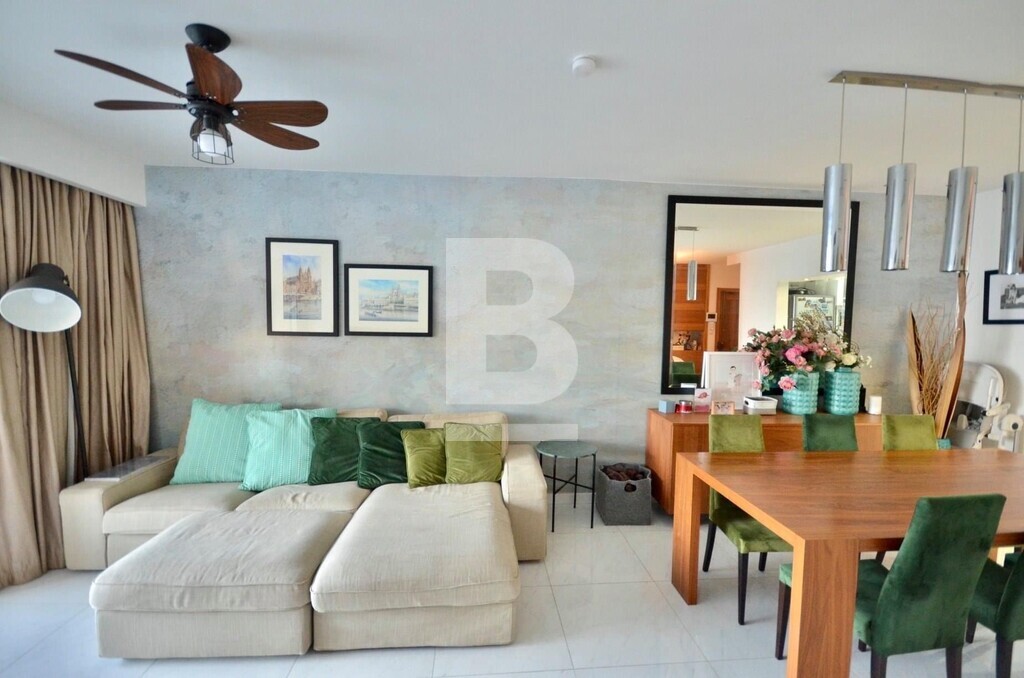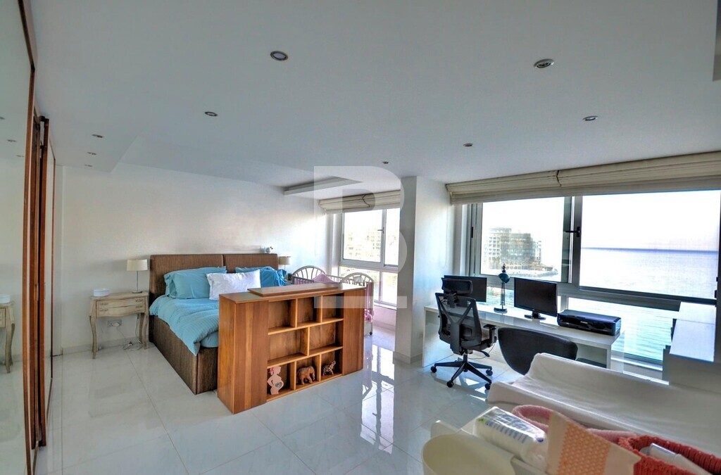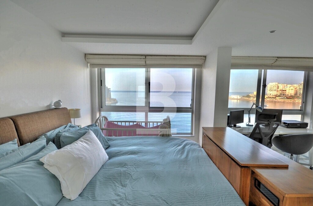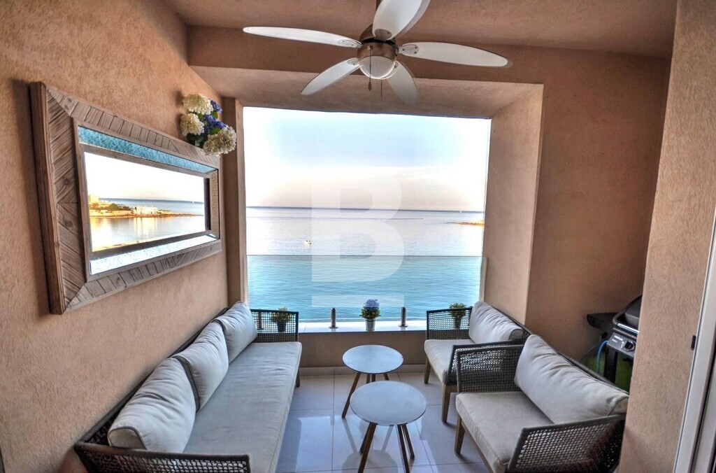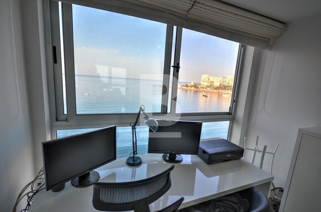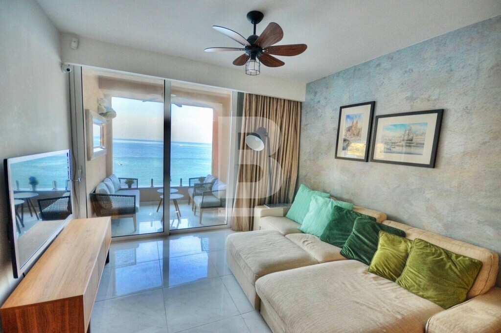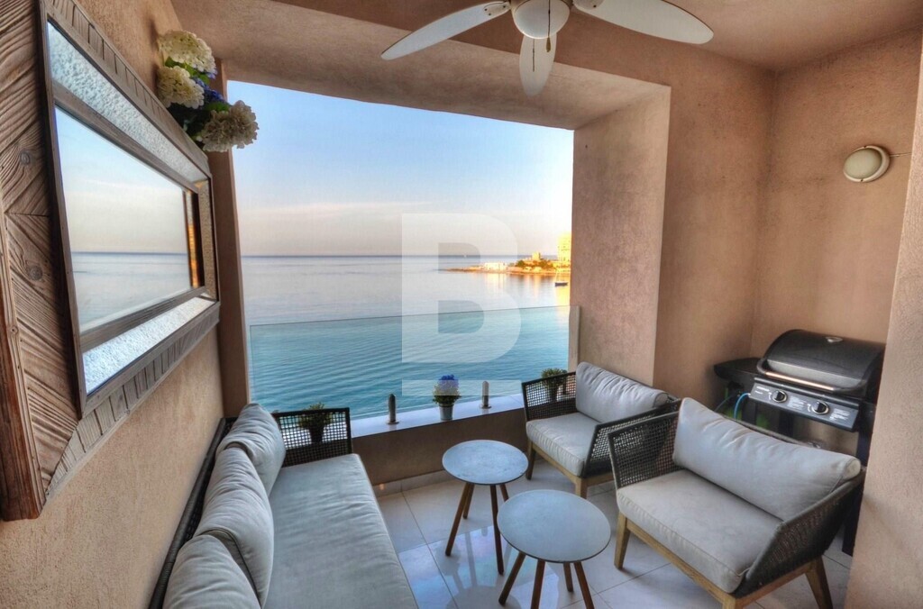 Fully furnished, fifth floor, seafront APARTMENT, situated in St Julian's within walking distance to most amenities. Property comprises spacious open plan fully equipped kitchen/ living/ dining area, leading out onto a front terrace enjoying unobstructed sea views, two bedrooms, main having and en-suite and guest bathroom. Property is being sold fully furnished, air-conditioned and has use of roof.
