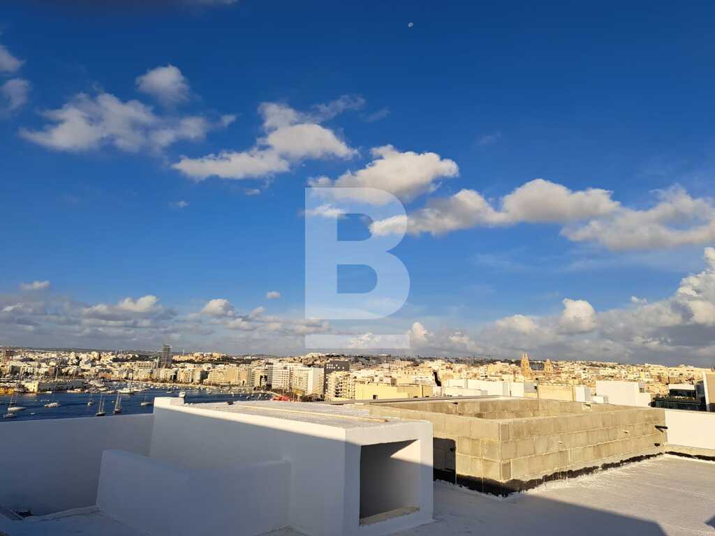 Sliema:A Corner Duplex Penthouse situated in the heart of this sought after area within walking distance from the seafront, beaches, restaurants and all other amenities. This property is a corner Penthouse built on high grounds surrounded with large Terraces and offered in Shell form. Layout comprises an open plan kitchen /living dining room with pantry, three double bedrooms all with bathroom en-suite and guest toilet. Optional garage available