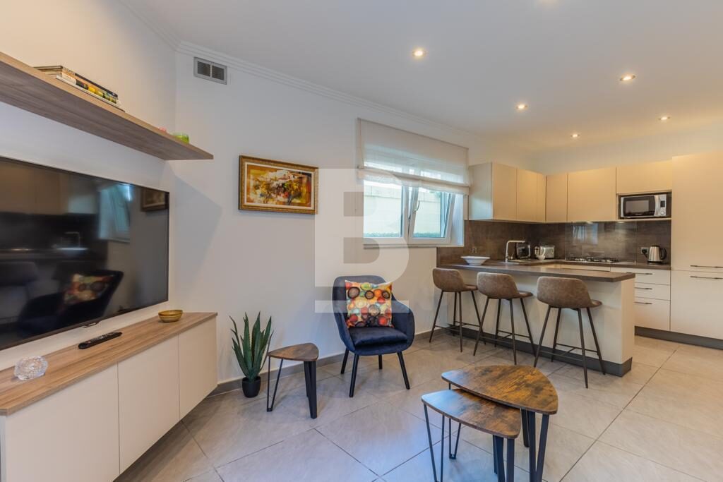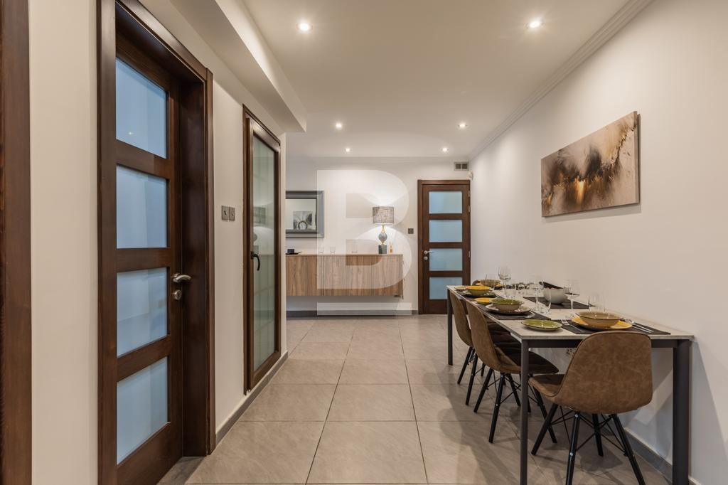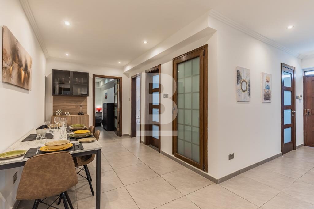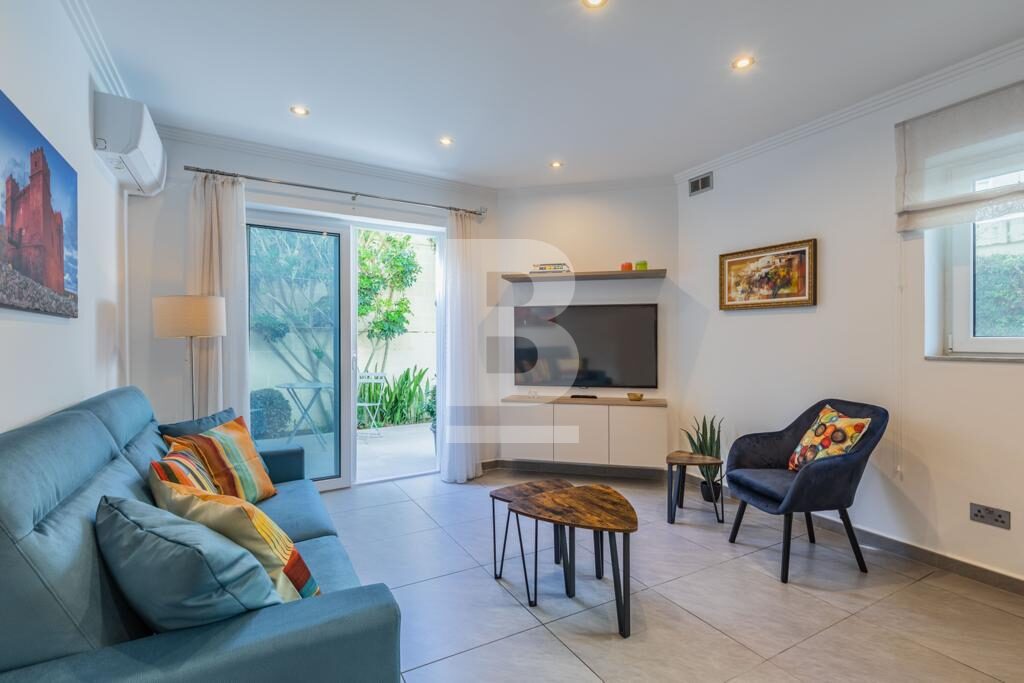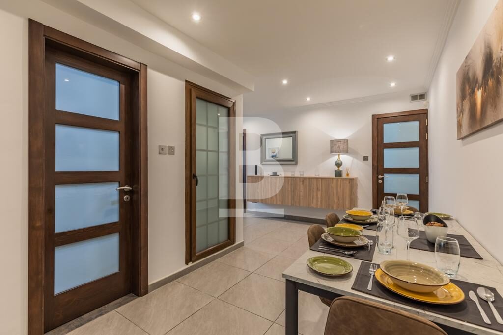 Swieqi. Newly refurbished corner two bedroom fully furnished ground floor maisonette located in a residential area with outdoor entertaining area. Open plan kitchen/living, dining area, two bedrooms, two bathrooms. Walking distance to all amenities, entertainment area, beaches and promenade. Ready for immediate occupation. Call your agent for viewings.