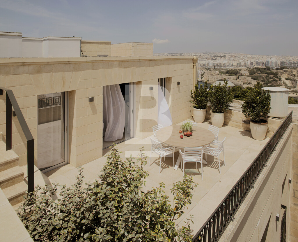 A Highly finished and designed according to renders and plans is this impeccably designed 2 bedroom , 297sqm penthouse, 129sqm internally and 168sqm externally. Comprising a very large open plan kitchen/living/dining that leads on to a massive 180 degree terrace with views and splash pool. On the elevated level one finds two double bedrooms, a very large master bedroom with en suite and a sizeable walk in wardrobe/dressing room. 2nd bedroom with walk in wardrobe, toilet, shower room, which also leads on to the terrace. AC throughout. Property is served with a lift. Must be seen to be fully appreciated. Property is being sold Fully furnished and is Freehold .