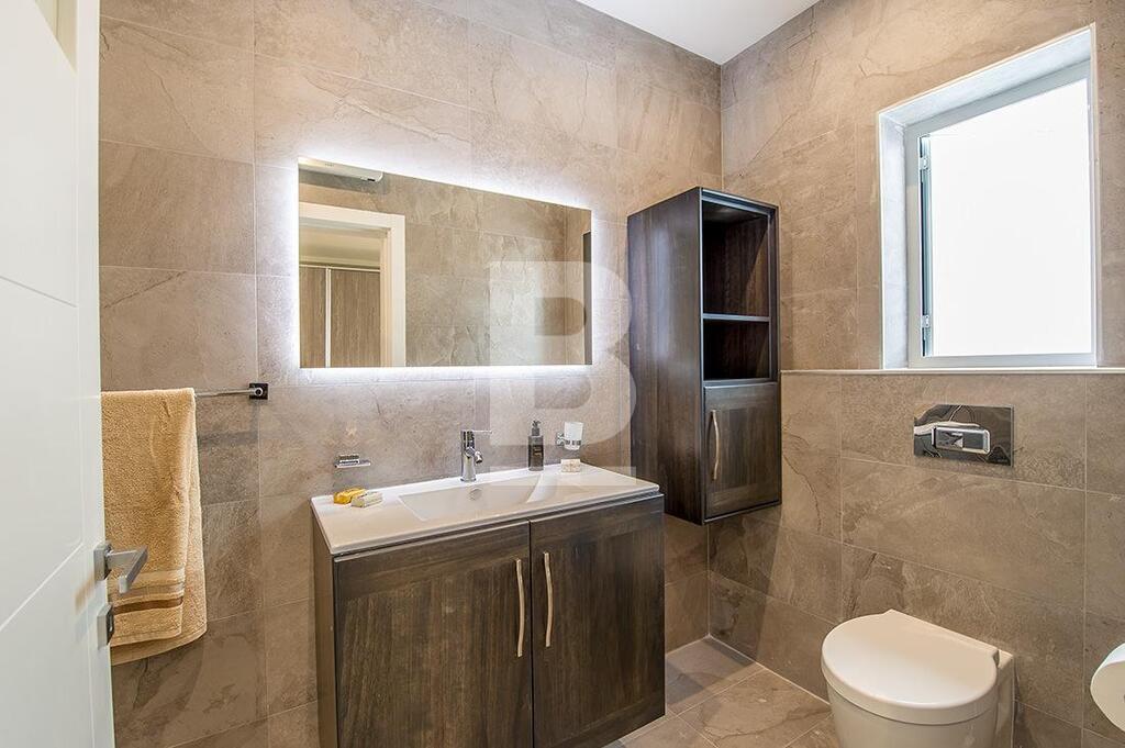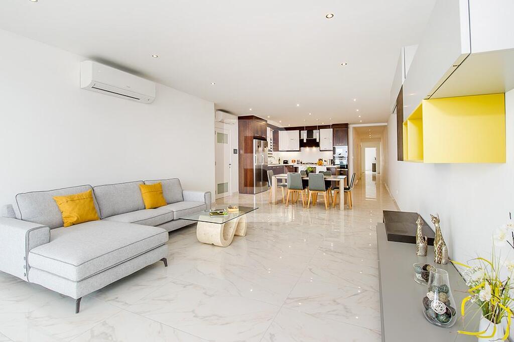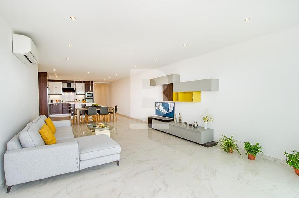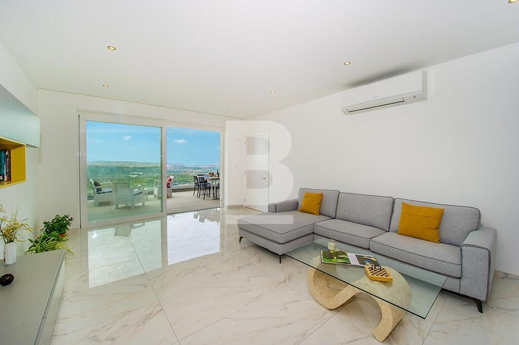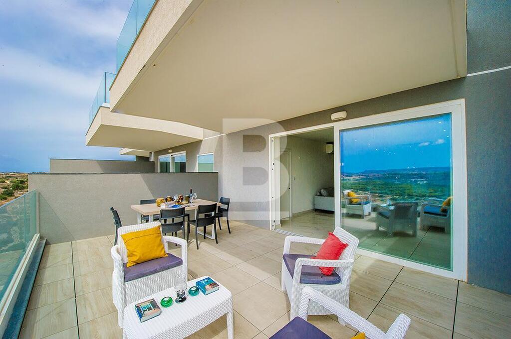 A luxuriously furnished 6th floor APARTMENT situated in a brand new Special Designated Area exclusive development overlooking the valley and enjoying magnificent country and sea views from its spacious terrace. The layout consists of a spacious open plan fully equipped kitchen, living and dining area leading onto a front terrace, 3 double bedrooms ( two of which have en-suite bathrooms), a guest bathroom and a storage room. A back balcony is also available. This luxury property boasts many features such as a video intercom and intelligent lights which can be controlled via smart phone. This apartment includes double-glazing aluminium with UV filters, high quality polyurethane insulation, waterproofing, gypsum soffit and inverter air-conditioning in all bedrooms and living area. Situated on high ground in a very quiet area close to a fitness centre, sports club, kids’s nursery, school and playground. Other amenities such as shops, pharmacies, post office, restaurants and banks are just a five-minute walk away.