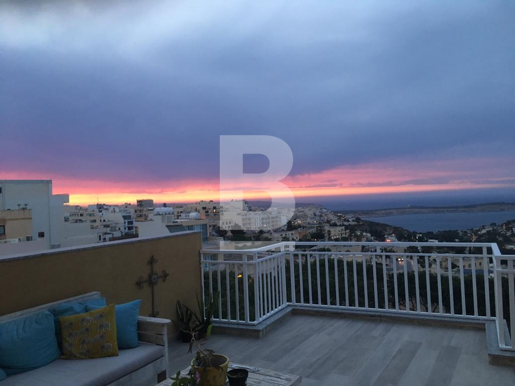 A luxurious and spacious penthouse enjoying panoramic views of the sea and skyline, offering stylish quality living in the highly sought after village setting of Mellieha.This unique three bedroomed property of over 210m2 occupies the entire top floor of an exclusive small residence located upon the highest ground in the tranquil village. The luxury and quality in its modern interior is infused with a touch of iconic African ambience to create an enviable home. The large main bedroom resembles a luxury hotel suite with "His and Her" double showers with rain showerheads, a free-standing bath, heated towel rail and a sofa for relaxation. The separate bathroom boasts exquisite stone "His and Her basins", bespoke floating cupboards and wc. The master bedroom also includes a walk-in wardrobe which leads onto the sunny back terrace. Each guest bedroom benefits from an air conditioning, fitted wardrobes and a good size en-suite shower room. The spacious guest wc doubles up as a laundryroom. The large open plan living/dining/kitchen area is packed with style and quality. The bespoke locally made Grixti Mobili 'soft-touch' kitchen with Iron Corten counter tops.The current owners have spared no expense on attention to detail from construction to delivery of the final product - from the Travel Northwhite Tiles and Skirting, Osmio Pro-II Whole House Water Filter System, video entry system, smoke and carbon monoxide alarms to six-seater Jacuzzi on the front terrace. The property benefits from three phase electricity supply, and takes full advantage of the Maltese sunshine with a PV System with 16 PV Panels and a Solar Water Heater. The top of the range commercial air conditioning system, Thermaseal insulated roof, rockwool insulated East wall and argon gas filled double or triple glazed apertures combine to keep the property cool in summer and warm in winter. On rare chilly winter evenings, the PAXFOCUS wood burning fireplace brings a warm comfort to the living space, while the two Burda Perfectclime Wall Mounted Patio Heaters provide warmth on the front terrace. This freehold property comes with full ownership of the airspace.