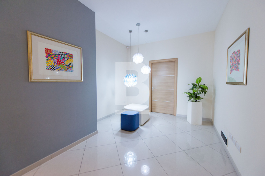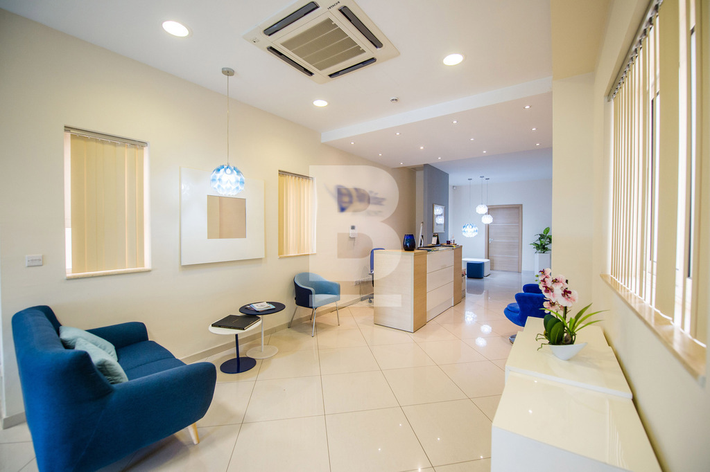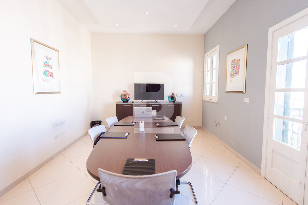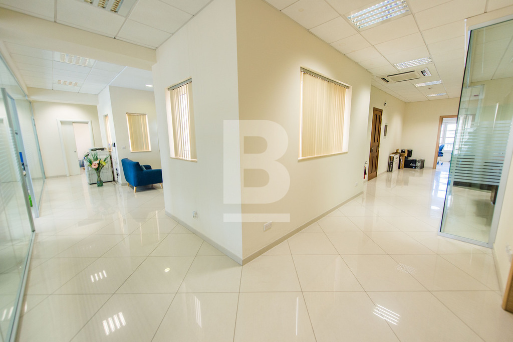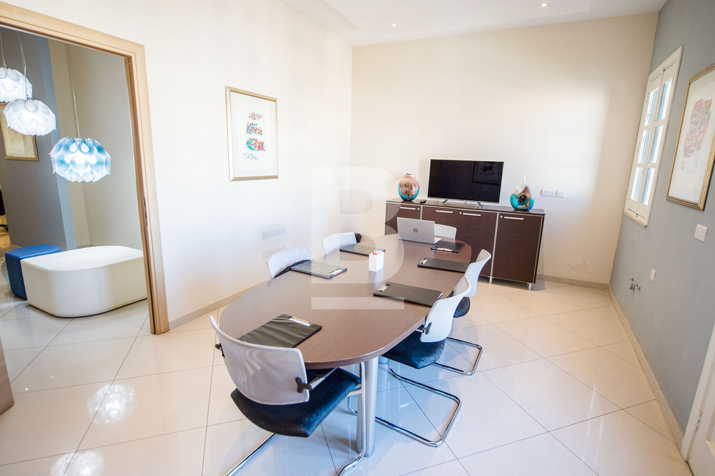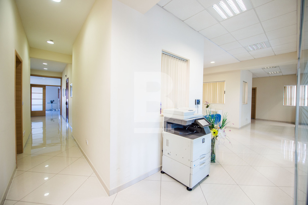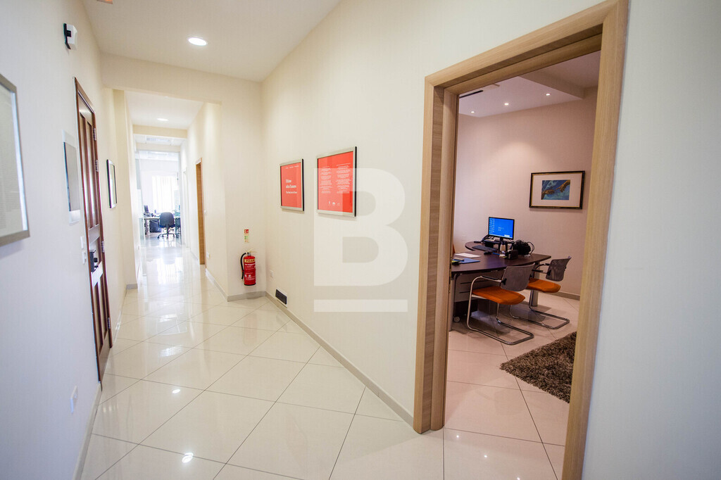 Set in Naxxar's bustling village centre amongst all amenities, busy cafes, eateries, clinics, and other businesses and surrounded by residential dwellings, this remarkable office premises is wide fronted and takes over the space of 3 apartments with 3 separate entrances. The facade of this building depicts traditional Maltese architecture and characteristics, giving it an almost majestical look from the outset, and is complimented with modern decor internally. Common areas are well serviced by 2 elevators and the internal layout has been cleverly designed to accommodate a large office space measuring circa 320sqm hosting a welcoming entrance hall, numerous independent multi-purpose workspaces, a boardroom, meeting rooms, managers offices, directors office, server room, kitchen and storage areas. The space accommodates 30 people very comfortably, possibly more. The building also includes a garage complex at the basement level that can include at least 3 car spaces for management or staff. The property is offered fully furnished with top-quality furnishings, a complete server room with a Pabx telephone system, and wifi connections. Preparation for a generator is also allocated in the basement but has to be provided by the tenant. This is one of the few properties available that can host a fully functional business immediately with no work needed.