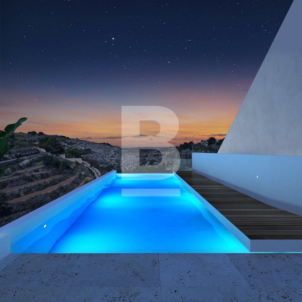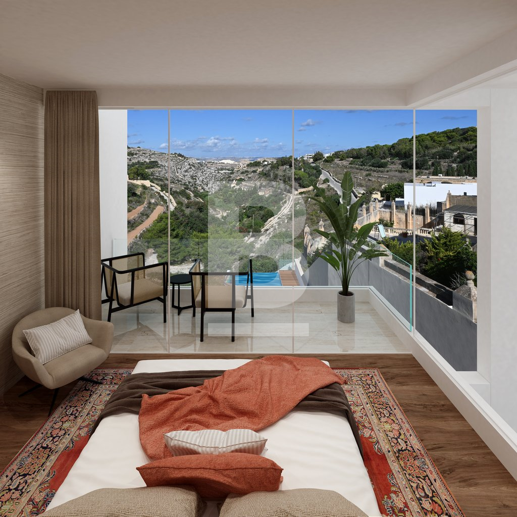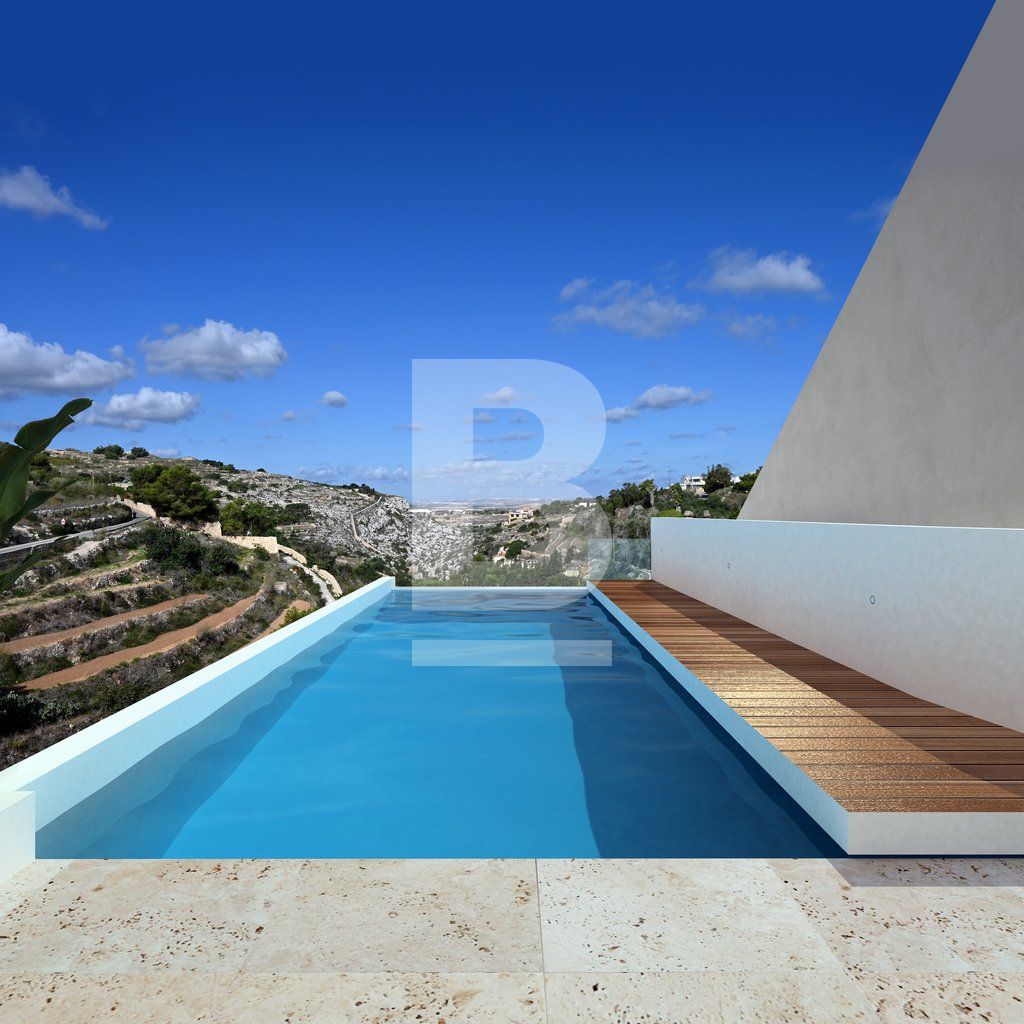 An exceptionally well positioned 5-bedroomed, newly built villa, located at the exclusive neighbourhood of Madliena, set on high grounds overlooking Madliena Valley, with unobstructed and guaranteed country and sea views as far as Gozo, just a short distance from St. Julian’s and Portomaso Marina. Built on a 550 sqm plot and accessible from 2 streets, the property consists of a larger than usual 120 square metre living area, with a double height lounge area. On the first floor one finds 2 double bedrooms, the master bedroom enjoys the unobstructed Views, has it's en-suite bathroom and private walk in wardrobe. The second bedroom leads onto a good sized terrace, also view with views and comes with it's en-suite bathroom. A spacious hallway also with views, can be used as a study area. A the lower level, one finds an additonal 2 bedrooms, one bathroom with side terraces. A separate lounge area at the pool level pool leads onto the 100 sqm pool deck and a large 10 metre infinity pool, with unobstructed country and sea views up to the Gozo. An independent 50 sqm private home office / 5th bedroom / GYM, complements this property, with extensive soft landscaping as well as discreet service areas have also been incorporated in the property’s open plan design. A comfortable 3 car garage with an additional car carport makes this property truly unique for the discerning client. The property is being sold in advanced shell form, with all external rendering and water-proofing complete, and internally in shell form to be completed to the buyer’s specific requirements. The developer is available to complete the property to the buyer’s specifications. Viewing is highly recommended for the property to be appreciated.