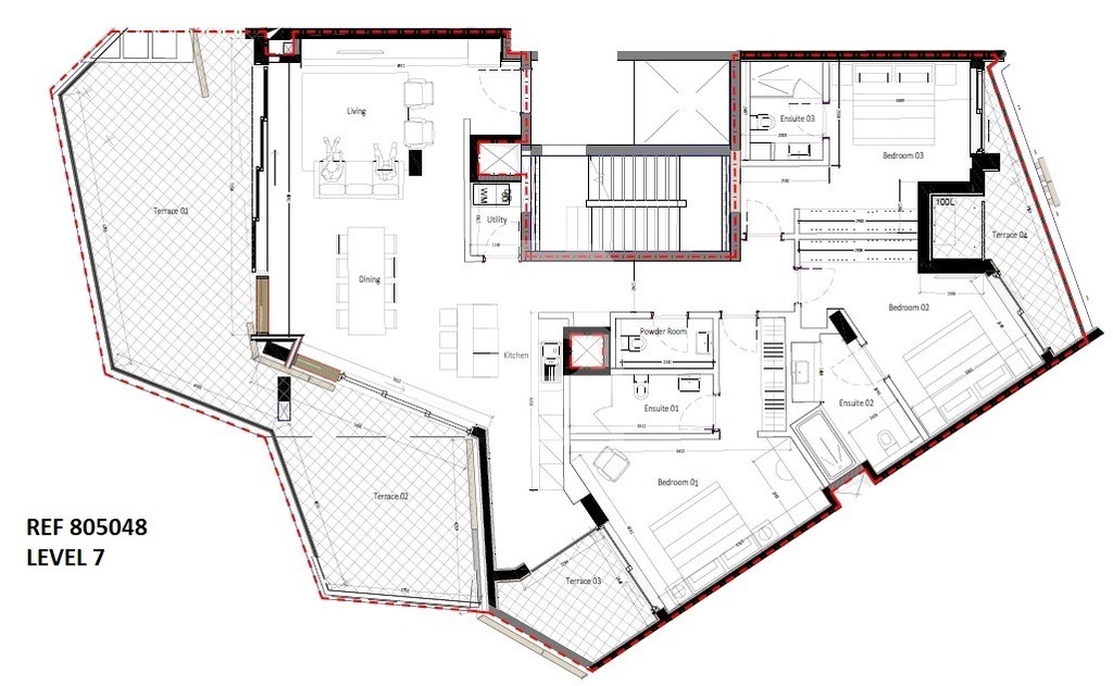 A new high-end development offering an exclusive collection of 87 residential units spread across two distinct blocks. These stunning residences offer a varied mix of 1 to 4 bedrooms, duplexes with private pools and penthouses with an excellent choice of sizes, layouts, and orientations. All units will be delivered highly finished, including underfloor heating in bathrooms, concealed air conditioning and intelligent lighting. With a range of premium doors, tiles, and bathroom fixtures, residents can make their homes their own, ensuring that every aspect of their living space reflects their distinctive preferences. High-quality glazed aperture doors and windows enhance the sense of open living spaces within the residences whilst design measures have been taken to mitigate sound transmission, inclusive of insulated walls, floors and ceilings between residences. Large pjazzas and vast areas of landscaping are also available for residents to enjoy with underground garages and spaces equipped with electric charging points. The development which enjoys an SDA certification, is located in a peaceful corner of Rabat right upon a ridge with breathtaking countryside views within a short distance from Mdina, represents a unique residential proposition, giving owners privileged access to upscale amenities and hotel-level services. The development also offers a spacious communal infinity pool with a pool bar, professional concierge and security services, a well-equipped fitness centre as well as a state-of-the-art spa. This is a 257 sqm (163 + 91) penthouse situated on the seventh floor enjoying partial views and comprises an entrance hall onto an open plan kitchen/living/dining leading out onto spacious terraces, 3 bedrooms with two enjoying ensuite facilities, a main bathroom and a utility room.