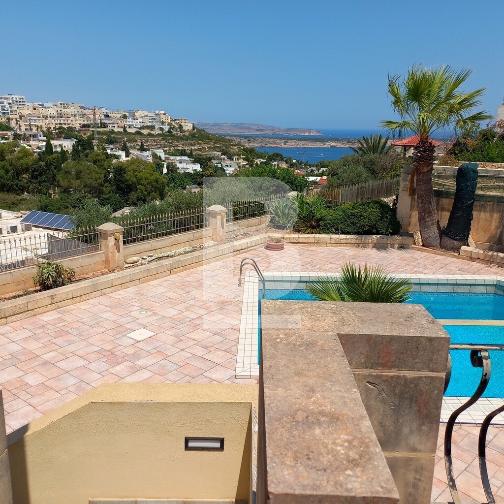 This hidden gem in the tranquility of Santa Marija Estate enjoys breathtaking unobstructed views of the Valley ,Comino and beyond . Having a long four car drive way and a two to three car garage .Making your way inside to a large welcoming entrance having the three double bedrooms ,ensuite and main bathroom on one side and a study ,guest bathroom ,kitchen and a large living/dining room leading onto the terrace overlooking the pool and enjoying beatiful views on the other.Having two seperate apts under the main floor both having independant entrances , both leading onto the pool deck .A very large storage space is also found making ample opportunities for other reasons .