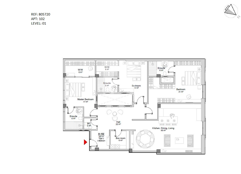 Apartment 102 is located on the first floor level with a footprint measuring 203sqm internally and 2sqm externally. Total 205sqm. Accommodation comprises an entrance hall, a large open plan kitchen/sitting/dining room (49sqm),three double bedrooms, three en-suite bathrooms, two walk in wardrobes, one guest toilet and a box room. More garage spaces are available at an additional price but are available on a first-come, first-serve basis.