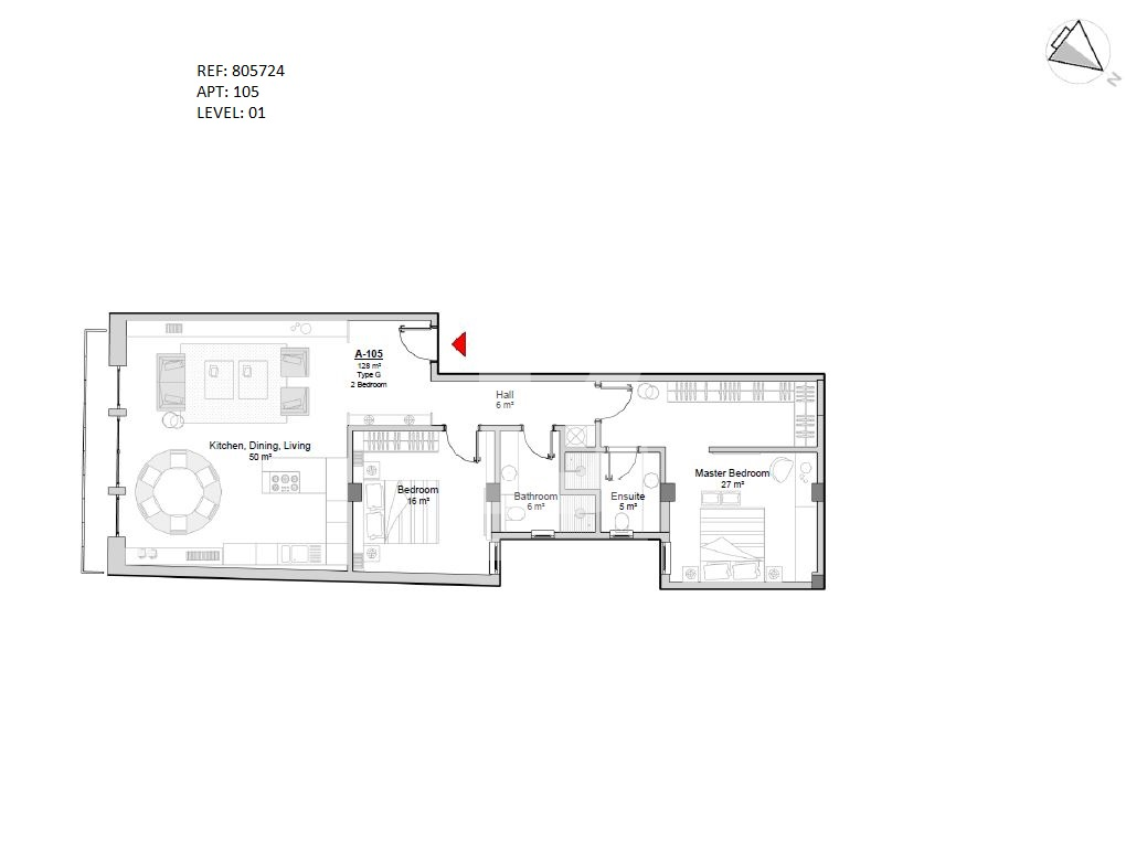 Apartment 105 is located on the first floor level with a footprint measuring 128sqm internally and 5 sqm externally. Total 133sqm. Accommodation comprises an entrance hall, a large open plan kitchen/sitting/dining room (50sqm),two double bedrooms, one en-suite bathroom, one walk in wardrobe, main bathroom, and one wide balcony. More garage spaces are available at an additional price but are available on a first-come, first-serve basis.