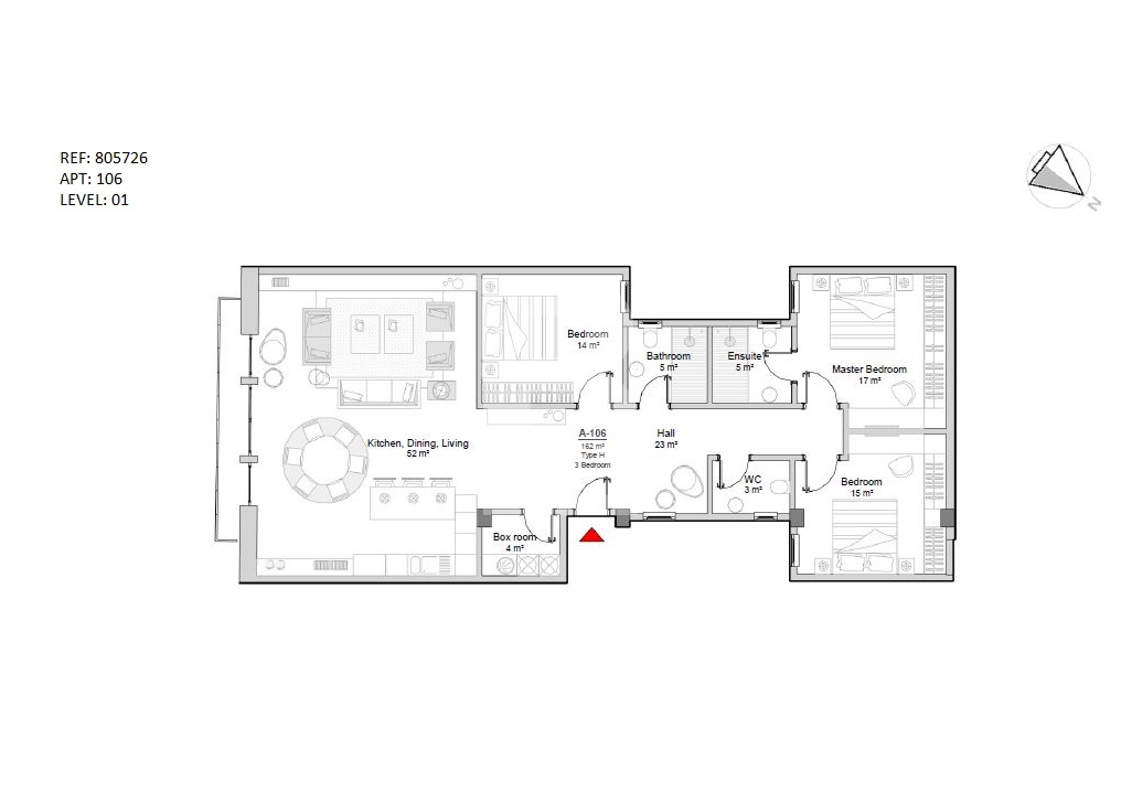 Apartment 106 is located on the first floor level with a footprint measuring 162sqm internally and 4 sqm externally. Total 166sqm. Accommodation comprises an entrance hall, a large open plan kitchen/sitting/dining room (52sqm), three double bedrooms, one en-suite bathroom, main bathroom, guest toilet, a box room and one wide balcony. More garage spaces are available at an additional price but are available on a first-come, first-serve basis.