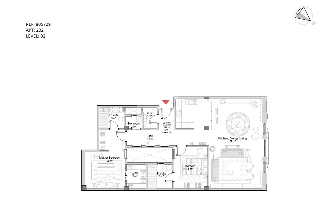 Apartment 202 is located on the second floor level with a footprint measuring a total of 144sqm and is being offered fully furnished to the highest standards. Accommodation comprises an entrance hall, a large open plan kitchen/sitting/dining room (59sqm), two double bedrooms, two en-suites, one walk in wardrobe, guest toilet and a box room. More garage spaces are available at an additional price but are available on a first-come, first-serve basis.