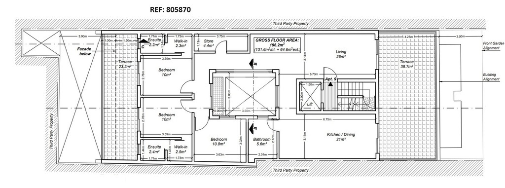 This charming and bright 4th-floor penthouse offers stunning open country views. With a total floor area of 196.2 m²—comprising 131.6 m² internally and 64.6 m² of external space—this property is designed for comfortable modern living. It features three spacious double bedrooms, two of which have en-suite bathrooms, a third double bedroom, and a main bathroom. The penthouse also includes a storage room, a well-Penthouse is being sold finished, incld its airspace, excld bathrooms and internal doors. The property is served by a lift and is offered with freehold ownership. An optional 1-car interconnecting garage is available.