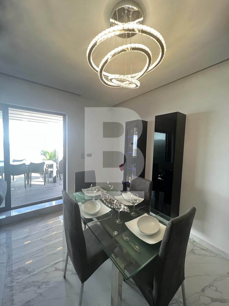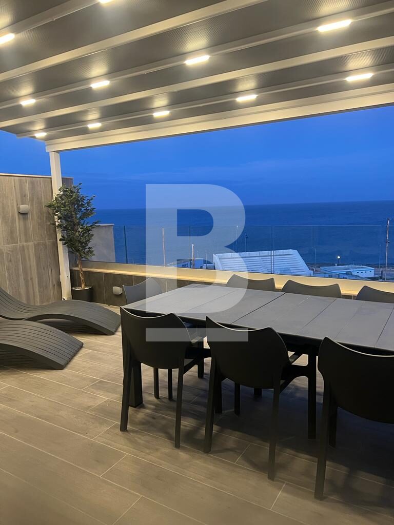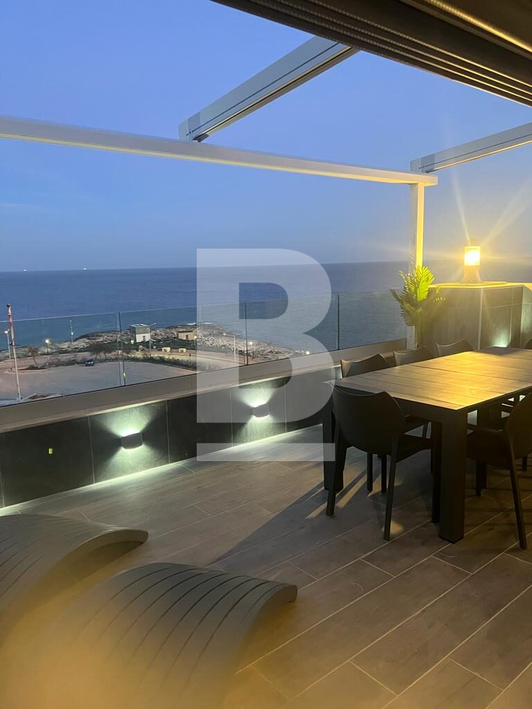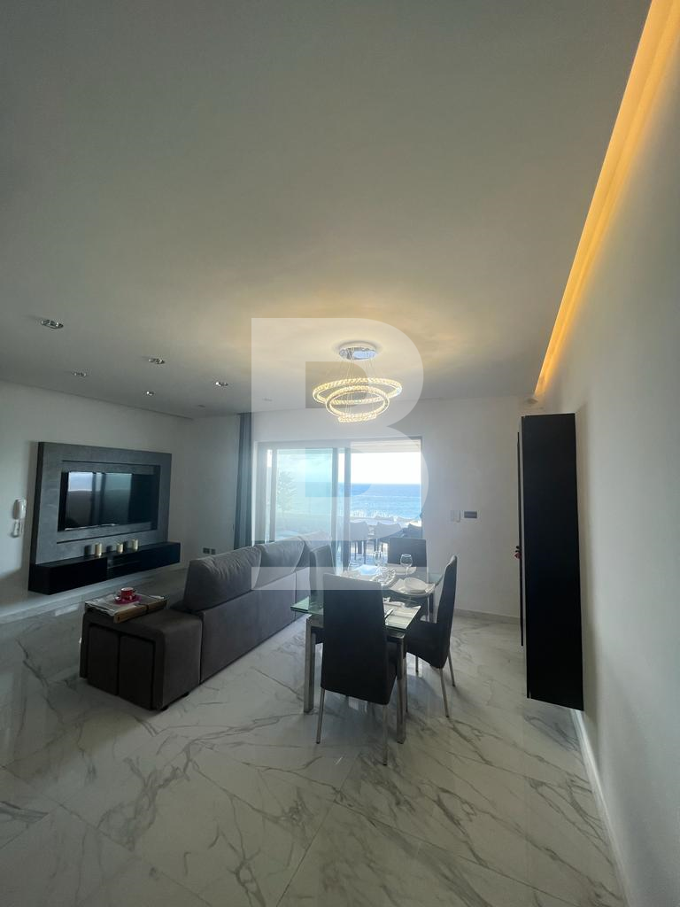 Modern, highly finished PENTHOUSE forming part of a lovely upmarket block situated in a quiet residential seafront area, close to all amenities. The property comprises an open plan fully equipped kitchen/living/dining area leading onto a terrace enjoying spectacular sea views and outdoor furniture great for entertaining and alfresco dining, two double bedrooms, a main bathroom, laundry room, and a good-sized back balcony. The property is fully equipped with air-conditioning units and includes a TV in all rooms, a washing machine, a lift, and an intercom. Must be viewed to be fully appreciated.