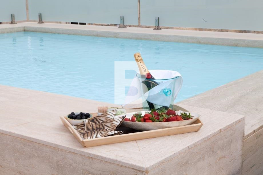 The upper floor is accessed via a striking glass staircase and comprises a double spacious bedrooms and a luxurious walk-in wardrobe. Additionally, there are two ensuite bathrooms. A hallway leads to an expansive deck area with an outdoor pool and comfortable leisure and dining furniture, offering a serene escape with stunning sea views towards Valletta.