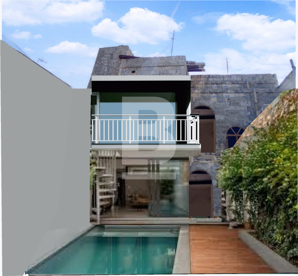 A traditional Maltese TOWNHOUSE with a garden with space for a pool, that has been structurally converted and is in the process of finishing works done on the Electrical and Plumbing on all floors. The approved plans are for an open plan Kitchen / Living and dining room, all in glass at ground level overlooking a garden with a pool. the first floor consists of two bedrooms, with ensuites ( one with valley views ) and at the second floor a large bedroom is planned with views.