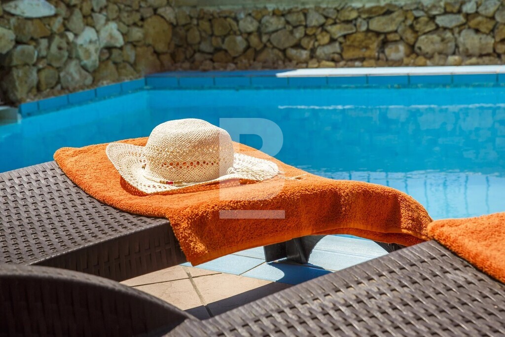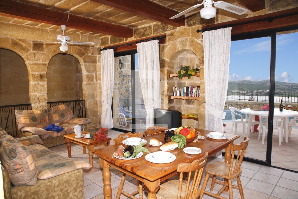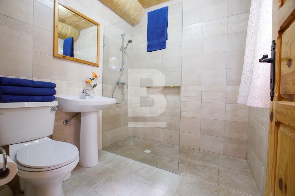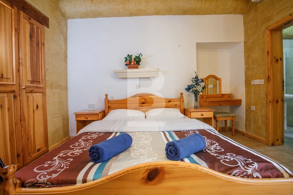 This house of character with exceptional views features a unique entry via a short walkway, leading guests to the ground floor where two spacious bedrooms with en-suite showers and a utility room. A rustic staircase ascends to the first floor, revealing a stylishly furnished arched living and dining area, a fully equipped kitchen, and a guest toilet. The first floor opens onto a private pool and terrace, complete with BBQ facilities, garden furniture, and sun loungers. The views are truly spectacular, especially during sunset.