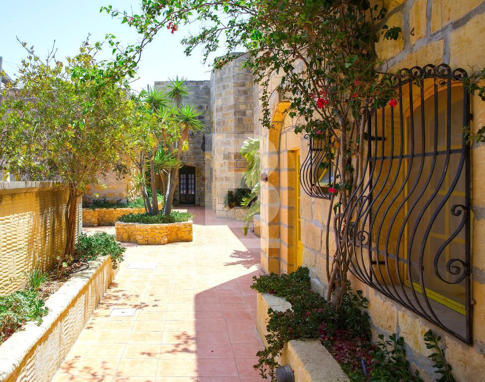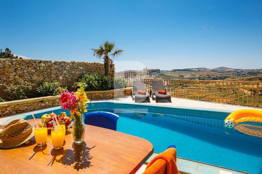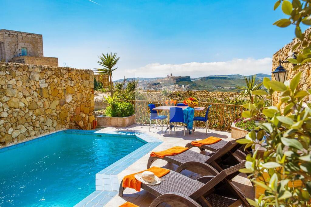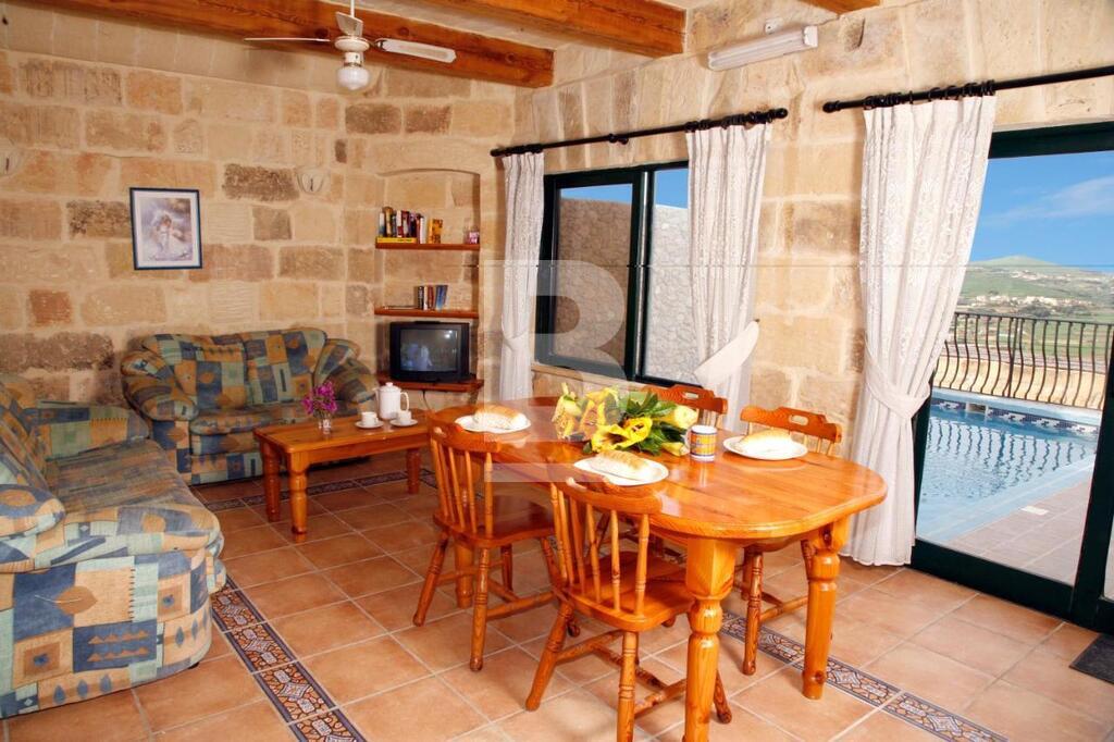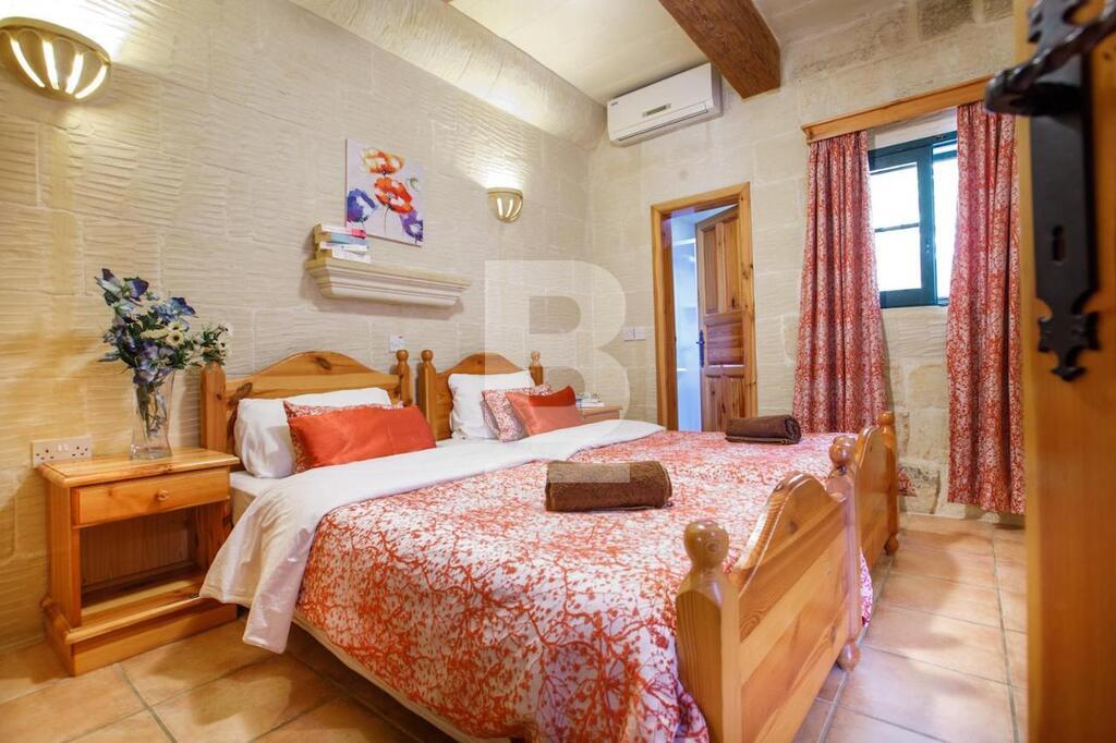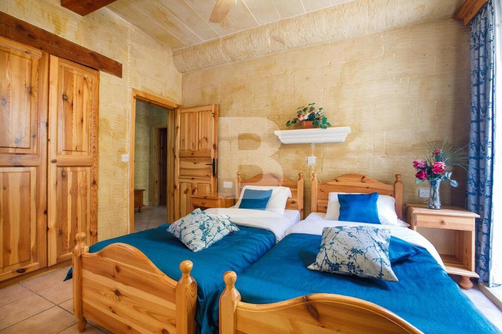 This property features a walkway adorned with plants and flowers leading to the entrance. Inside, a rustic living/dining area overlooks the pool terrace through large windows. The fully equipped kitchen is on the right, next to the utility room and spare toilet. The ground floor includes a master bedroom and a single bedroom, both with ensuite showers and views of the walkway. The private pool terrace has garden furniture, sun loungers, and a BBQ, offering magnificent sunset views over Victoria's citadel. A spacious staircase leads down to two more single bedrooms with ensuite showers and a charming courtyard, which stays cool in the summer.