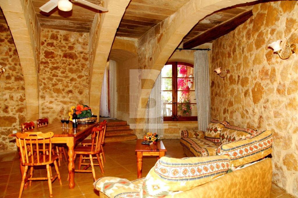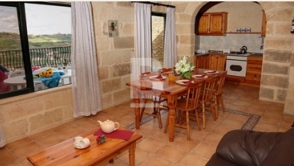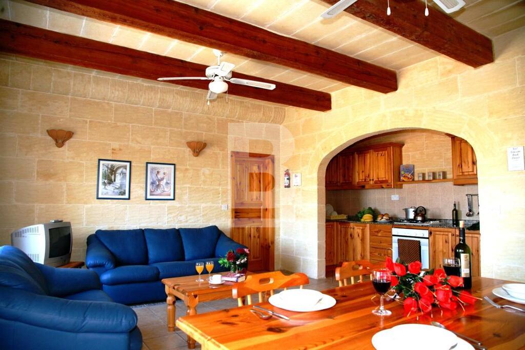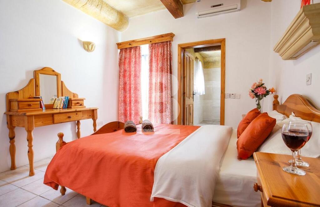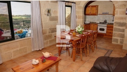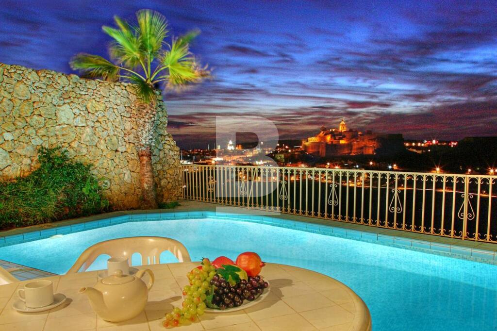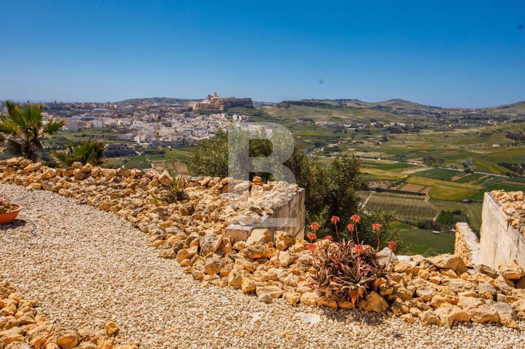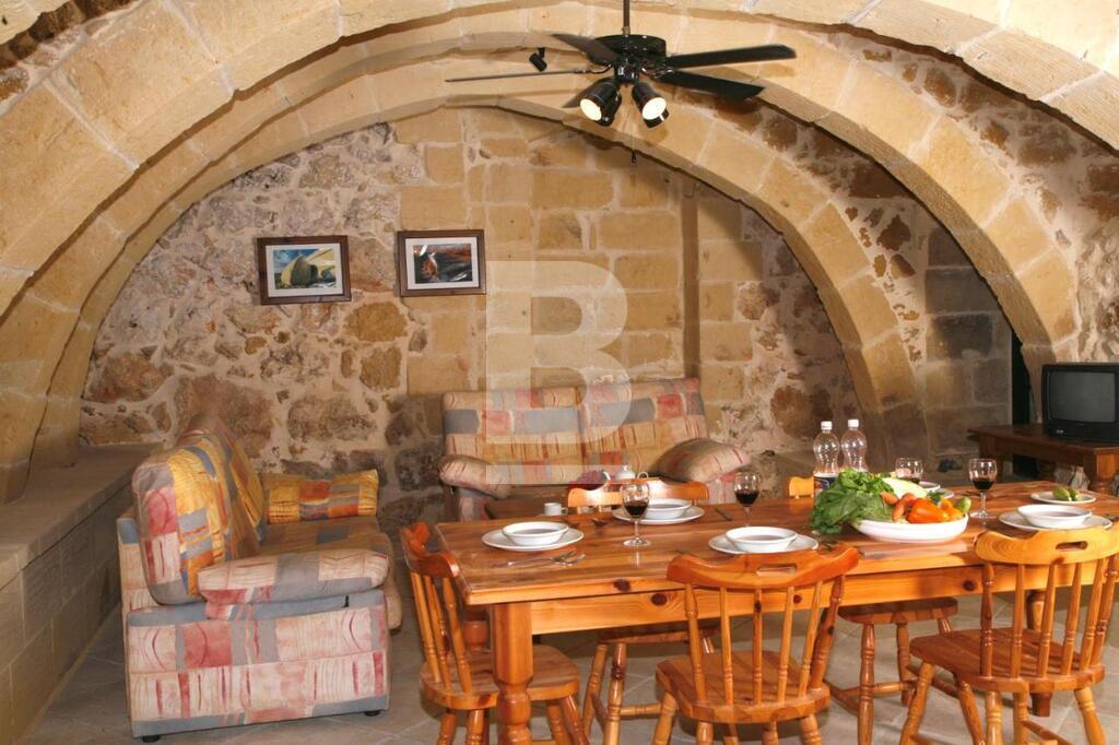 This property features a walkway adorned with plants and flowers leading to the entrance. Inside, a rustic living/dining area overlooks the pool terrace through large windows. The fully equipped kitchen is on the right, next to the utility room and spare toilet. The ground floor includes a master bedroom and a single bedroom, both with ensuite showers and views of the walkway. The private pool terrace has garden furniture, sun loungers, and a BBQ, offering magnificent sunset views over Victoria's citadel. A spacious staircase leads down to two more single bedrooms with ensuite showers and a charming courtyard, which stays cool in the summer.