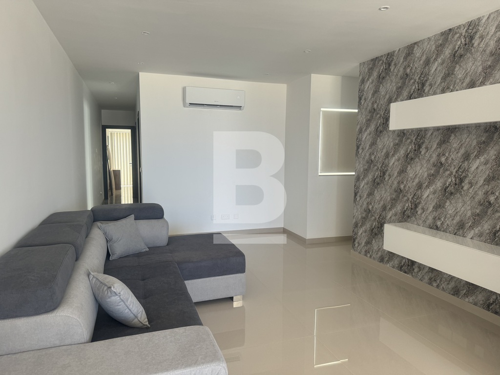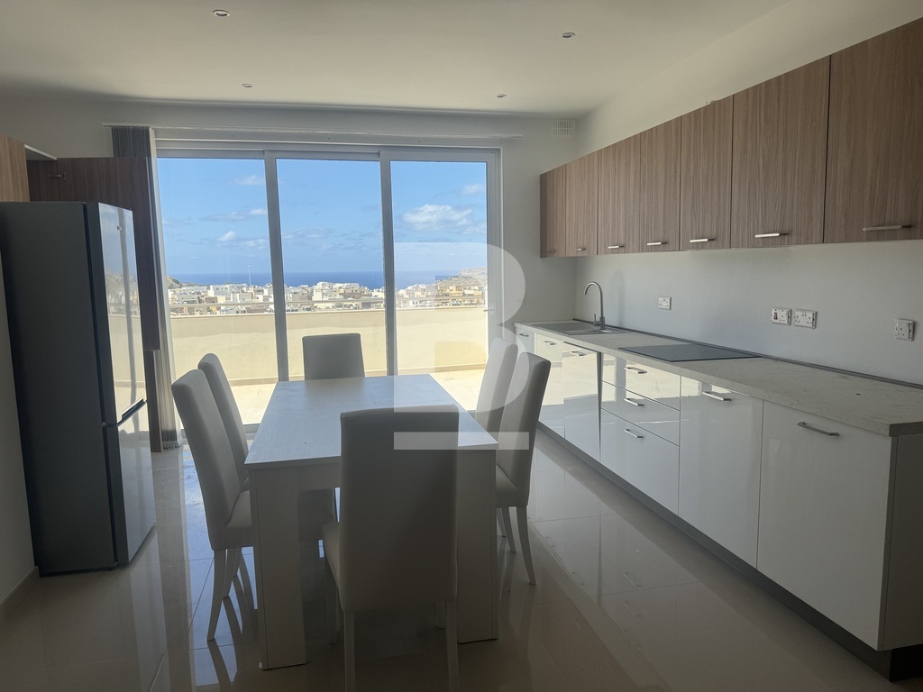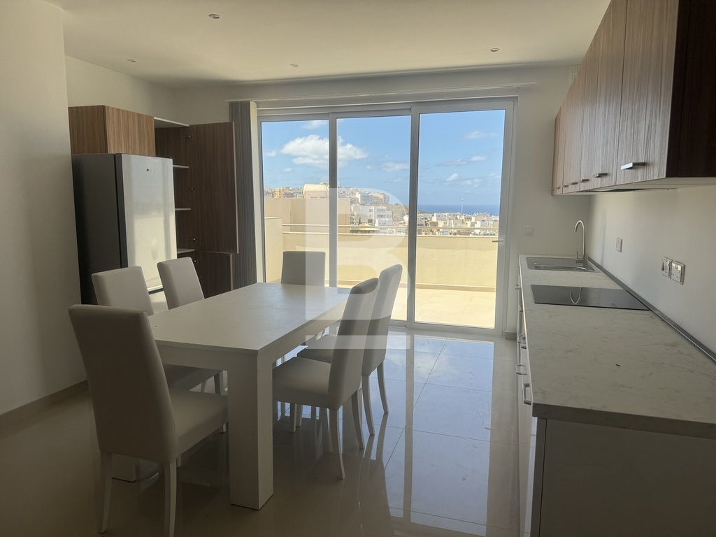 Highly finished and fully furnished 5th-floor penthouse situated in a quiet residential area of Mellieha and within walking distance to most amenities. The property comprises an open plan kitchen/ living/ dining area leading to a well-sized front terrace enjoying distant sea views, two double bedrooms (main with en-suite shower room) main bathroom, and a box room. This property is fully airconditioned and includes all the modern necessities. Garage is available at an additional cost.