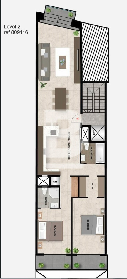 On entering the property you are greeted to an open plan kitchen/living/dining room overlooking a small balcony with side sea views. The two bedrooms at the back of the property, main with en-suite and second with a walk-in-waldrobe. Both bedrooms have an inter-connecting back terrace with space for a Jacuzzi.